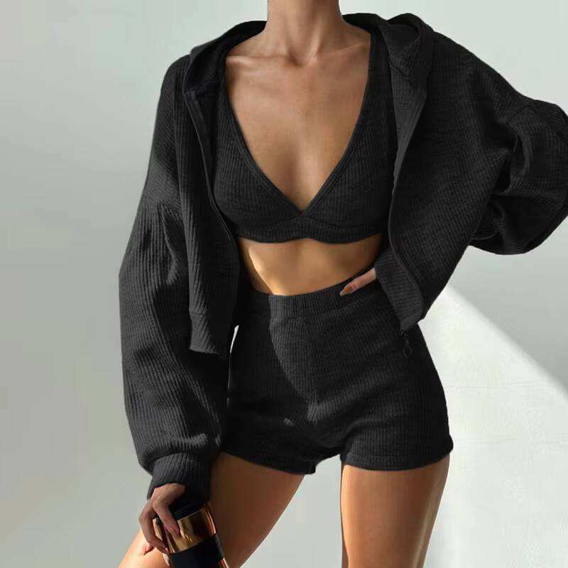 ชุดกีฬาสามชิ้นสีพื้นแบบเข้ารูป: เสื้อแจ็คเก็ตแขนยาวและกางเกงขาสั้นคอปกปกติ ทำจากผ้า