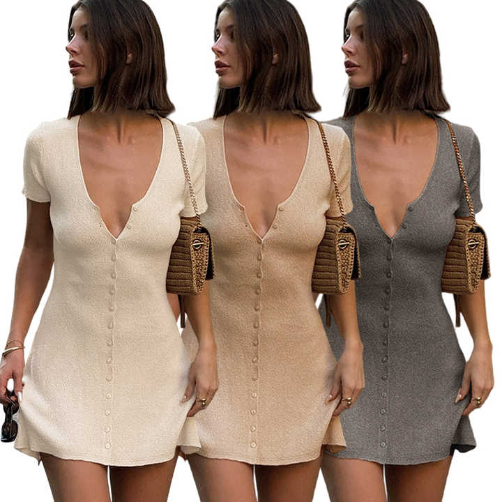 ชุดเดรสไหมพรมผู้หญิง สีพื้น ติดกระดุมด้านหน้า คาร์ดิแกนเดรสสั้น คอวีลึก ชุดลำลองใส่ทำงาน ชุดฤดูร้อน