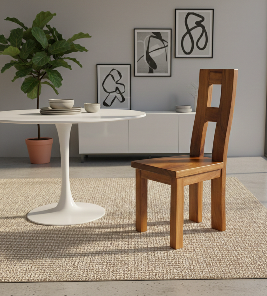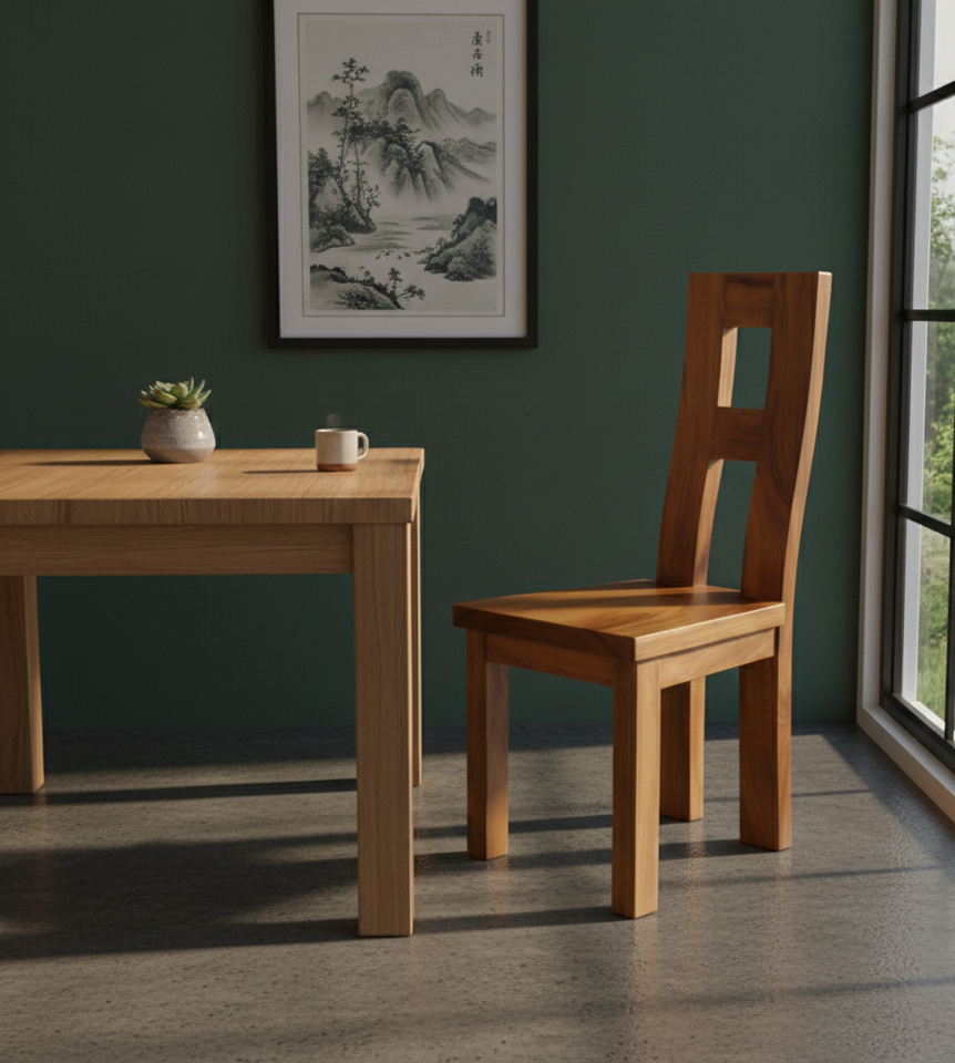 เก้าอี้ทานข้าวไม้สักแท้ ดีไซน์พนักพิงรูปตัว H สวยงาม ผลิตด้วยมือเพื่อความแข็งแรง ความงดงามตามธรรมชาติ และตกแต่งภายในห้องรับประทานอาหารให้ทันสมัย