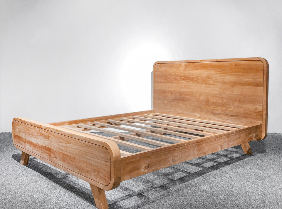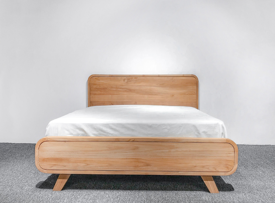 โครงเตียงไม้สักแข็งที่มีมุมโค้งมนและการออกแบบที่เรียบง่ายสำหรับเฟอร์นิเจอร์ห้องนอนที่ทันสมัยวิลล่าโรงแรมรีสอร์ทบนไม้