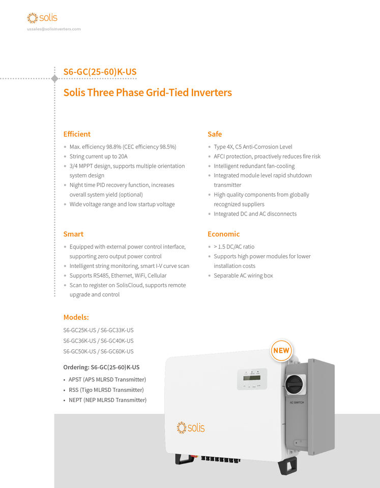 Solis S6-GC อินเวอร์เตอร์กริดสำหรับการค้าสามเฟส K-US (25-60) 25-60kW ช่วงพลังงาน480V ป้องกัน IP66ใช้งานกลางแจ้ง98.8%