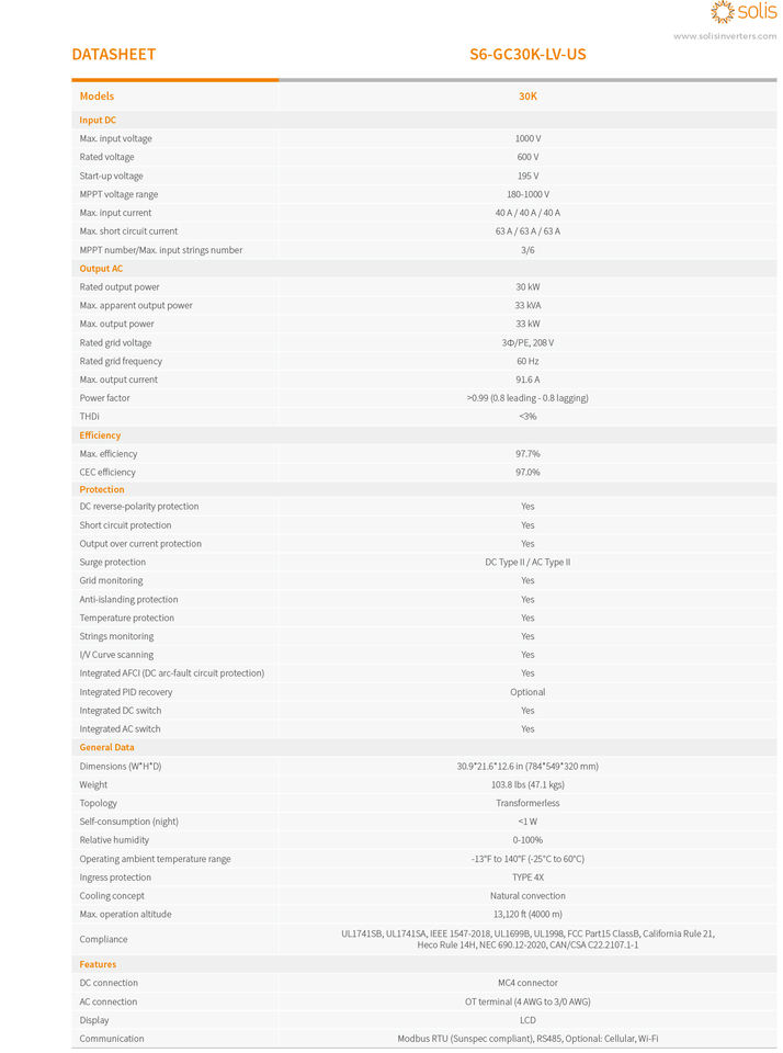 Solis S6-GC30K-LV-US 30kW Three Phase Inverter 1000V Max DC Input Surge Protection Efficiency 97.7% CEC Weighted Professional