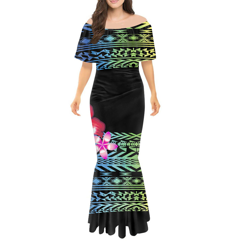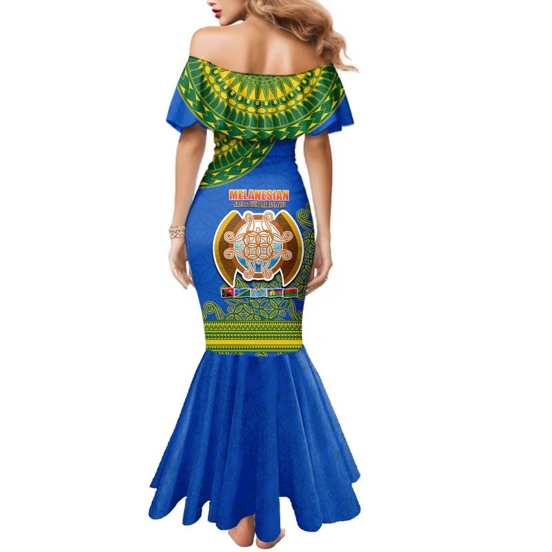 ชุดเดรสทรงเมอร์เมดแบบเมลาเนเซียนสำหรับเทศกาลของหมู่เกาะโซโลมอน ลายพิมพ์แบบชนเผ่า ออกแบบเองได้ สวยสง่าสำหรับผู้หญิง แบบเปิดไหล่ แต่งระบาย ทรงเข้ารูป