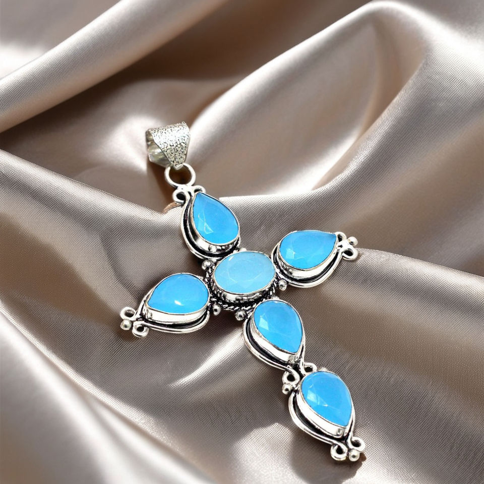 ทำด้วยมือเงินวินเทจเครื่องประดับทางศาสนาผ่อนคลายพลอยสีฟ้า Chalcedony ข้ามกรอบการตั้งค่าอัญมณีโบราณสำหรับ