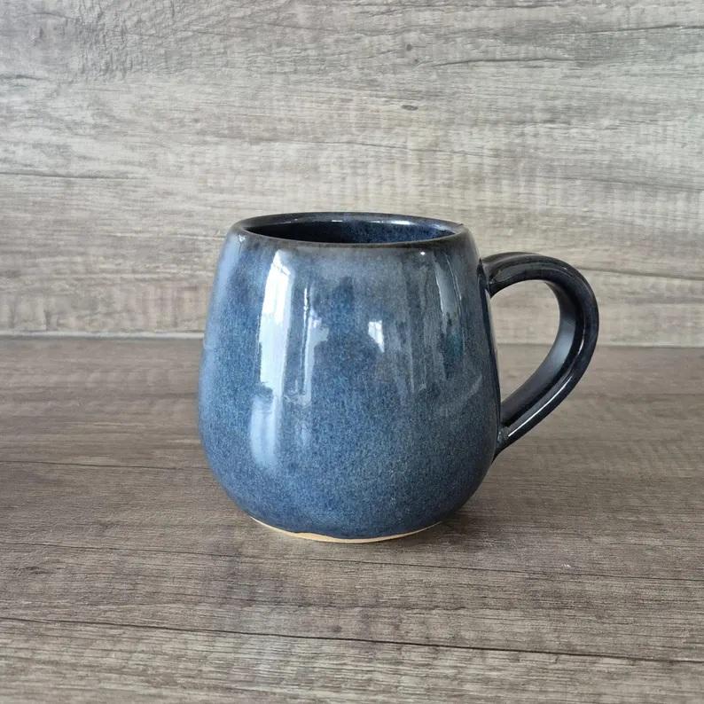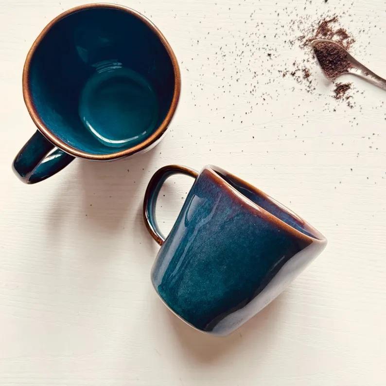 แก้วเซรามิกทรงโค้งเคลือบสีน้ำเงินเข้ม ดีไซน์หรูหรา พร้อมหูจับแข็งแรง ทนความร้อน เหมาะสำหรับเครื่องดื่มระดับพรีเมียม