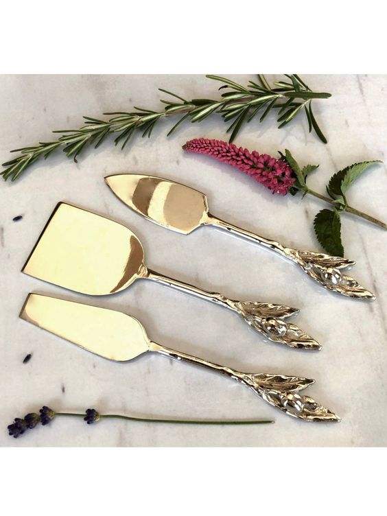 ชุดมีดหั่นชีสแบบแบนสแตนเลสเคลือบทองวัสดุไม้ไผ่คุณภาพสูง