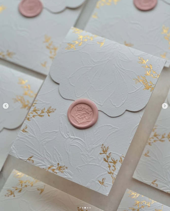 ซองฟอยล์สีทอง L + R สำหรับงานแต่งงานซองพิมพ์ลายดอกไม้ลายนูนปิดผนึกขี้ผึ้งสีชมพูมีฝุ่น