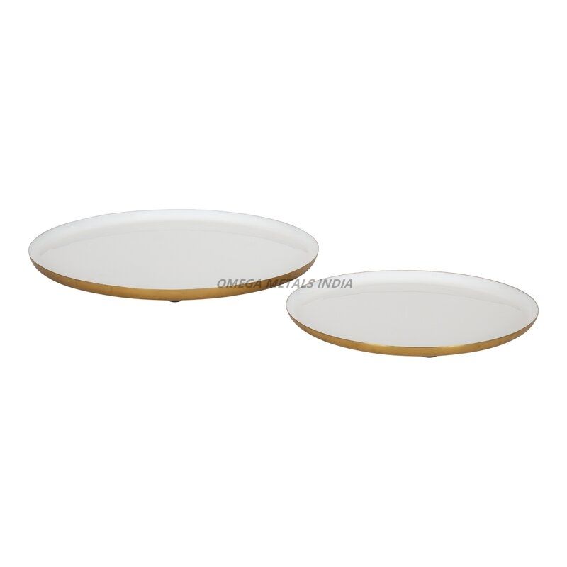 ถาดเสิร์ฟสีขาวทรงกลมที่ทันสมัยพร้อมขอบสีทองเหมาะสำหรับการแสดงของหวานและเสริมการตั้งค่าโต๊ะอย่างหรูหรา