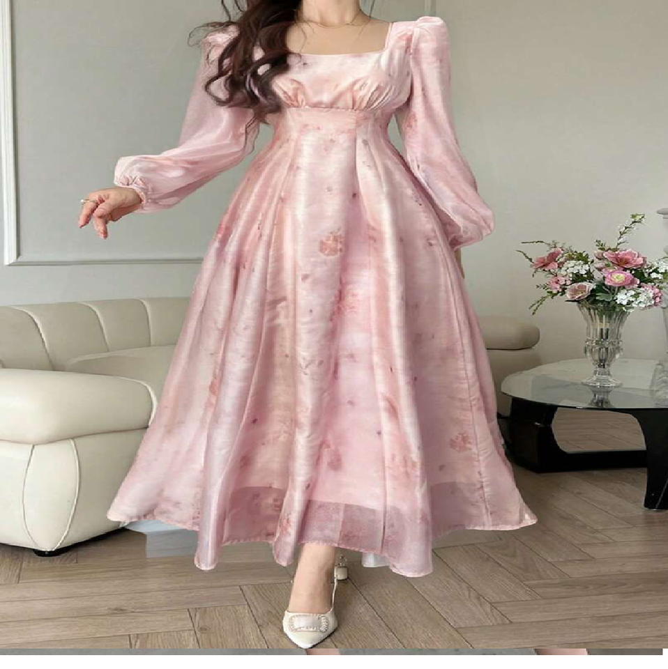 เดรสทรงเอลายดอกไม้สีน้ำเงินเข้มสุดหรู พร้อมแขนพองสุดอินเทรนด์ มีจำหน่ายในราคาขายส่ง