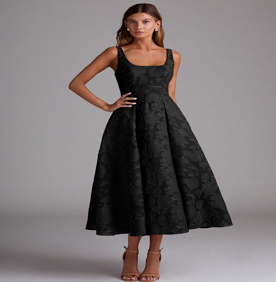 เดรสสีขาวทรงมิดิแบบผูกคอ ดีไซน์หรูหรา พร้อมทรงเข้ารูปและกระโปรงบานสวยสง่า มีจำหน่ายในราคาขายส่ง