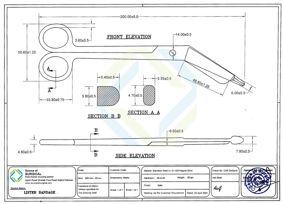 กรรไกรตัดผ้าพันแผลสแตนเลสสตีล Source Surgical SOS-049 ขนาด 200 มม. ใช้แรงมือ ได้รับการรับรองมาตรฐาน CE ระดับ Class I สำหรับคลินิก