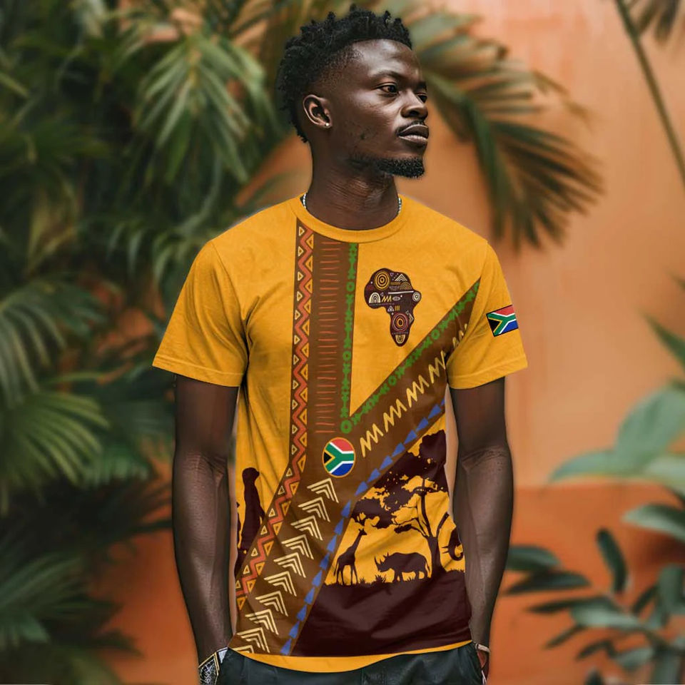 South Africa Inspired African Culture T-Shirt - Gold & Brown Tribal Pattern with Africa Map, Wildlife Silhouettes, Flag Design