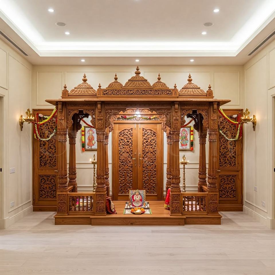 ตู้บูชาห้องนั่งเล่นงานฝีมืออินเดียใต้ ดีไซน์ดั้งเดิม 4 ลิ้นชัก ช่องเก็บของ ประหยัดพื้นที่ คุณภาพสูง ทนทาน ทำจากไม้สัก