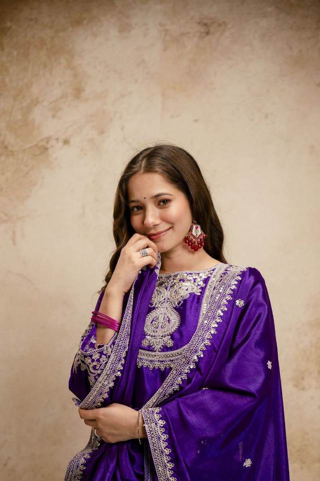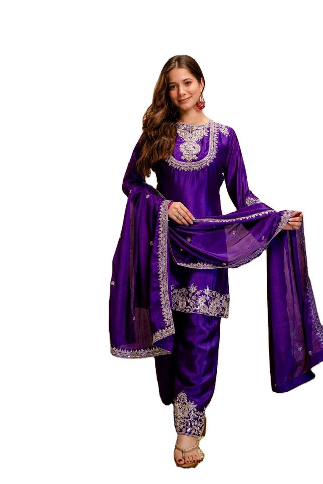 ชุดส่าหรีแบบอินเดียใต้ สีม่วงสวยงาม ผ้าไหมวิสโคสแท้ ประดับด้วยงานปักเลื่อมและลายฉลุ 3 ชิ้น สำหรับผู้ใหญ่