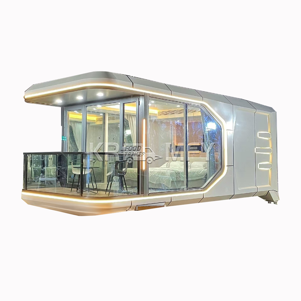 บ้านเคลื่อนที่สำเร็จรูปโครงสร้างเหล็กแบบโมดูลาร์ทรงแคปซูลอวกาศ พร้อมห้องครัวและห้องน้ำ สำหรับโรงแรมและที่พักแบบมีอาหารเช้า