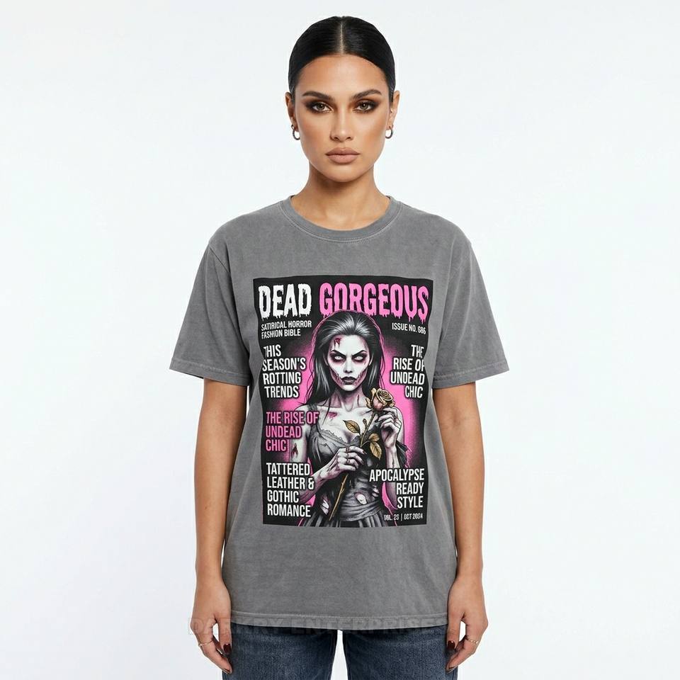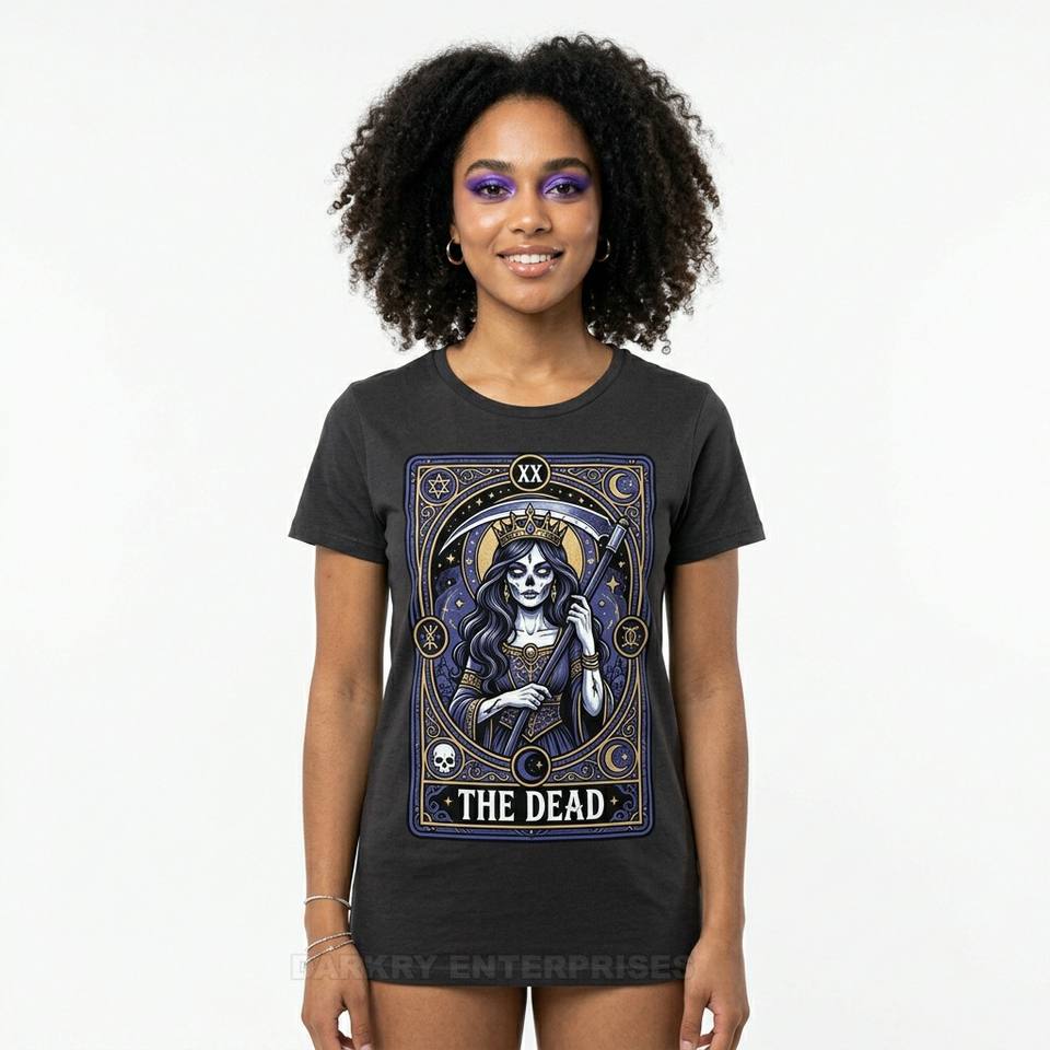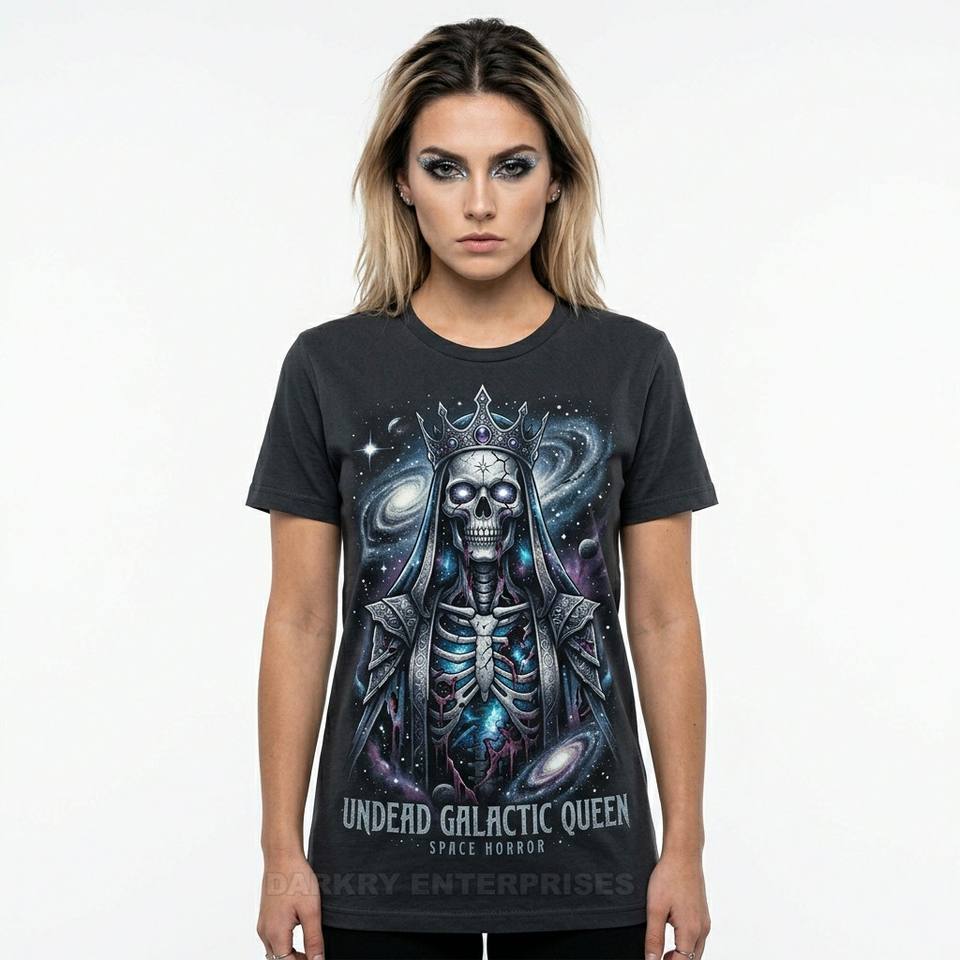 เสื้อยืดลายกราฟิกกาแล็กซี่แบบกำหนดเองสำหรับผู้หญิง ลายราชินีผีดิบสยองขวัญอวกาศ ผู้ผลิตเสื้อยืดผ้าฝ้ายลายโครงกระดูกโกธิคคอสมิก