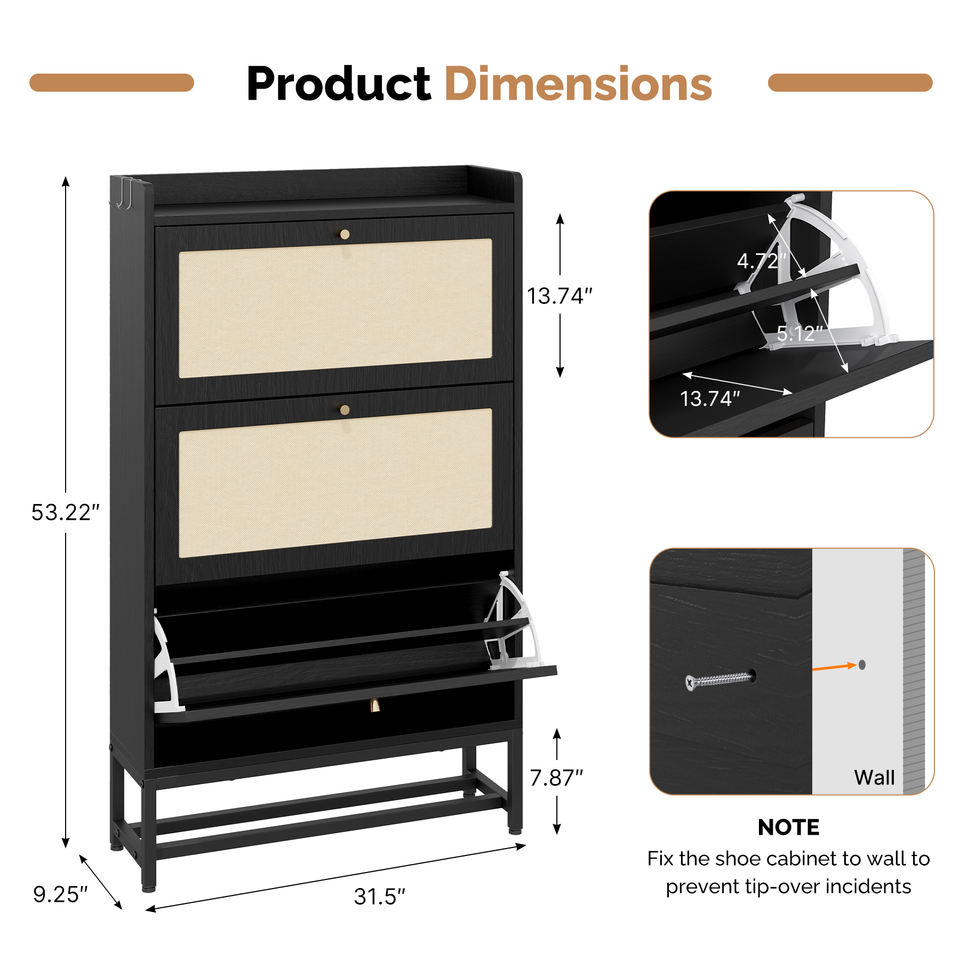 ตู้เก็บรองเท้าไม้แบบโมดูลาร์สีดำทันสมัย ประหยัดพื้นที่ ประตูบานเปิดแบบตาข่าย ชั้นวางปรับระดับได้สองตำแหน่ง ถอดออกได้ พับเก็บได้
