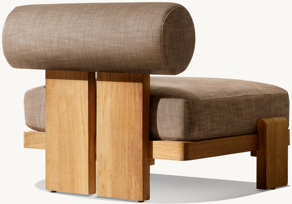 โซฟากลางแจ้งกว้างขวางพร้อมหมอนอิงสีเข้มและฐานไม้