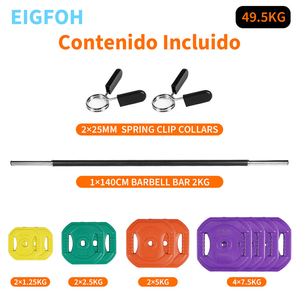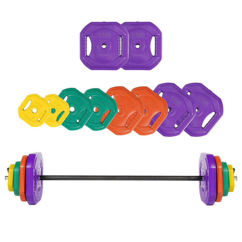 ชุดบาร์เบล 50 กก. สีสันสดใส ทนทาน ผลิตในสเปน พร้อมน้ำหนักคอนกรีตเคลือบ PVC เป็นมิตรกับสิ่งแวดล้อม อุปกรณ์ออกกำลังกายที่บ้าน