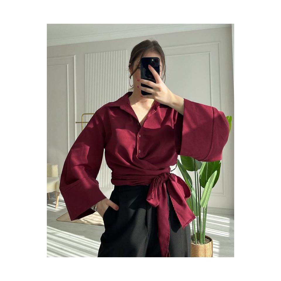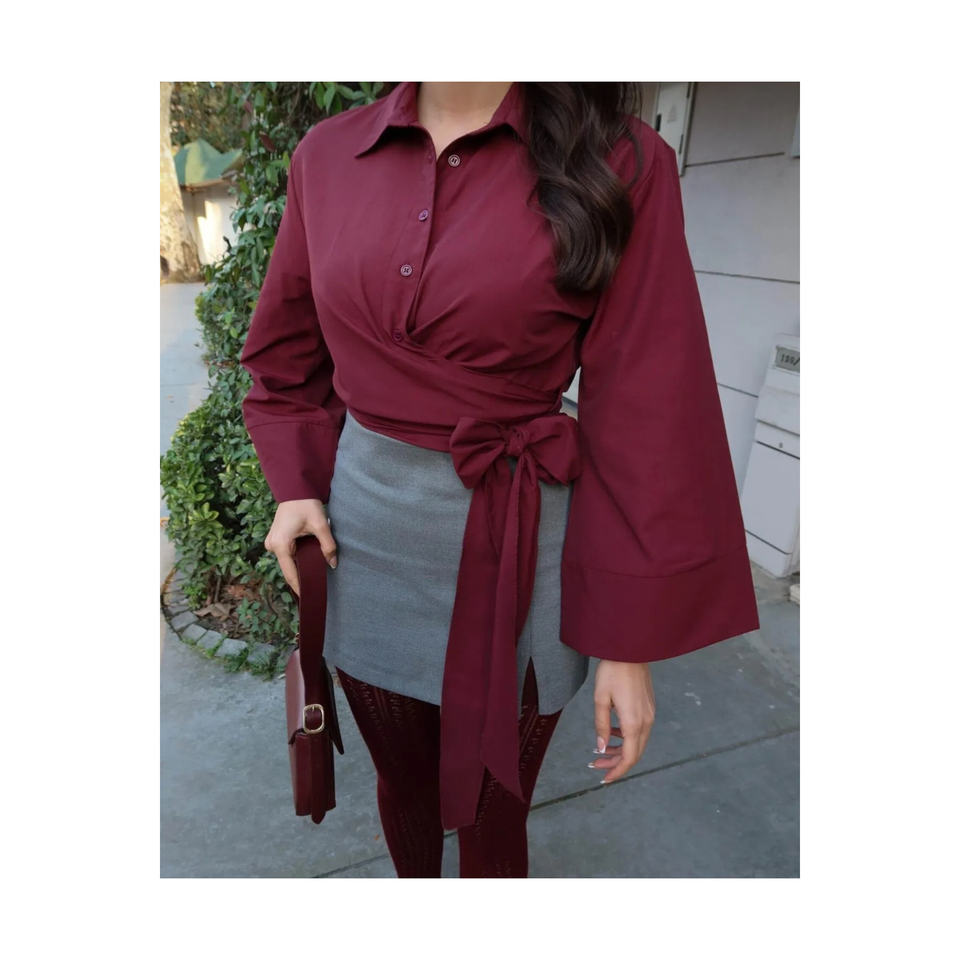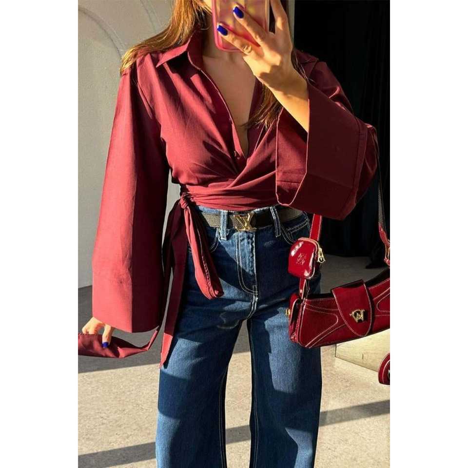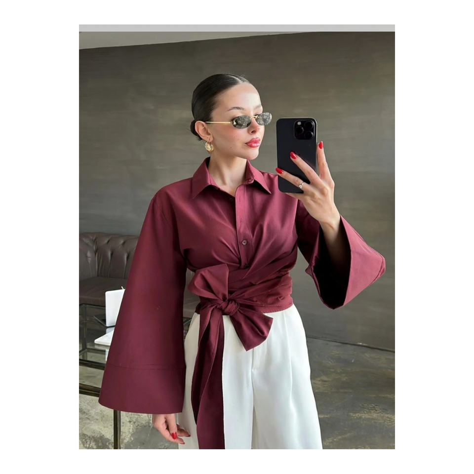 Spanish Oversize Pattern Sleeve-Tied Waist Belted Shirt