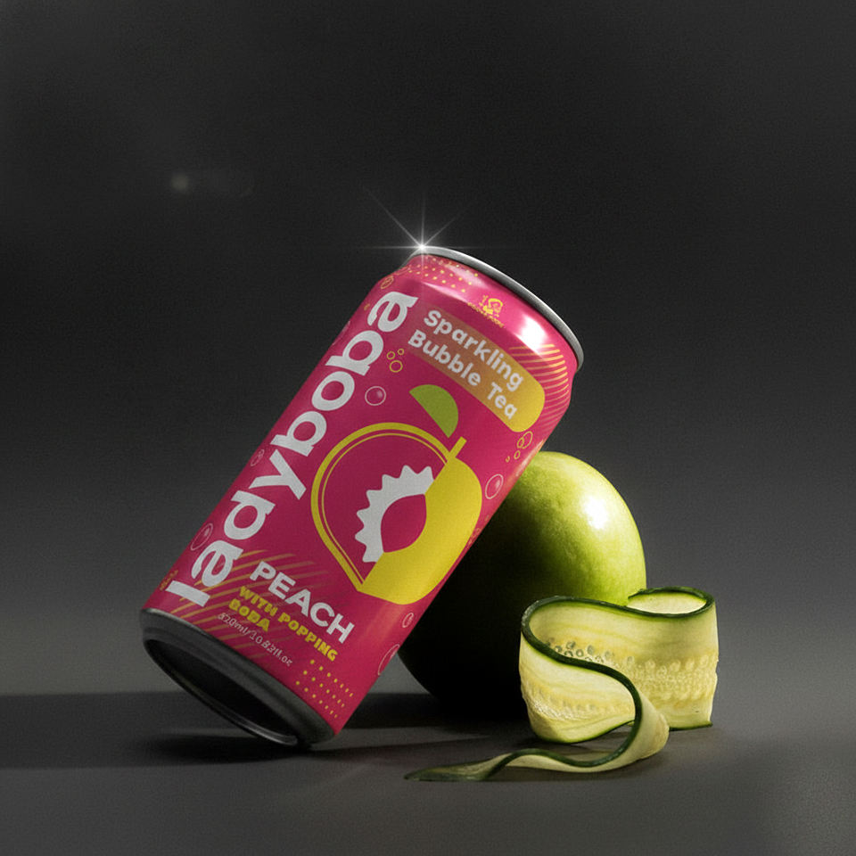 เลดี้ โบบา เบิร์สติ้ง สปาร์คกลิ้ง ป๊อปปิ้ง โบบา เครื่องดื่มรสพีชและองุ่น พร้อมเนื้อผลไม้ 310 มล. กระป๋อง