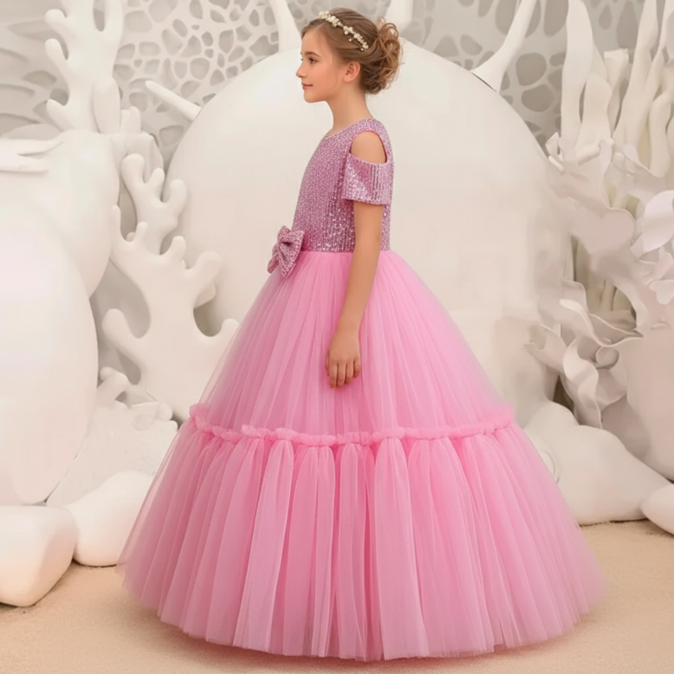 ชุดเดรสยาวสีชมพูประดับเลื่อมระยิบระยับสำหรับเด็ก ชุดราตรีเด็กผู้หญิงหรูหรา ชุดแต่งงานเด็กแบบเปิดไหล่ ขายส่ง