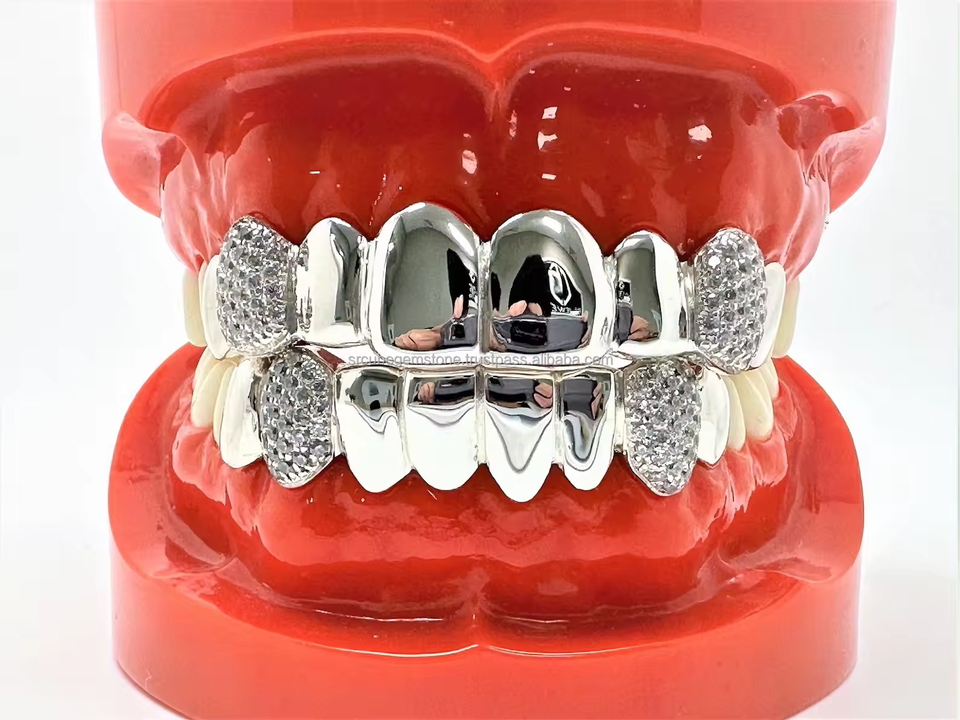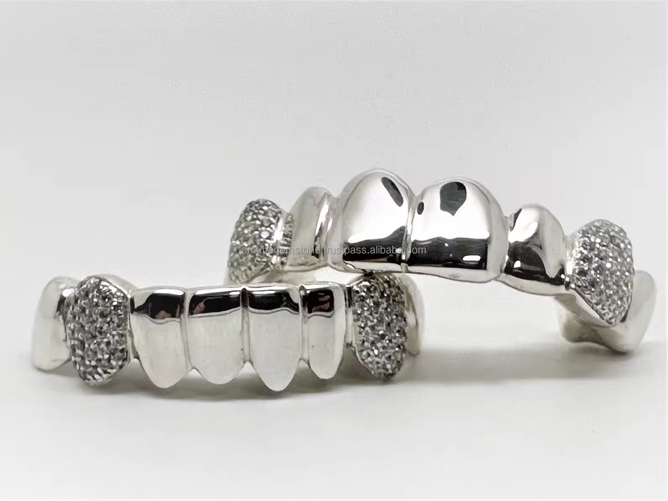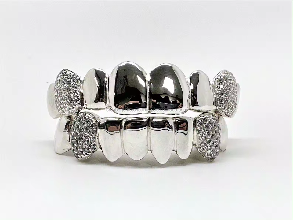 Sparklyและเงาเครื่องประดับทันตกรรมIced Out Grillzด้านบนด้านล่างMoissaniteเพชรปรับแต่งสีฟันสําหรับผู้ชายผู้หญิงของขวัญ