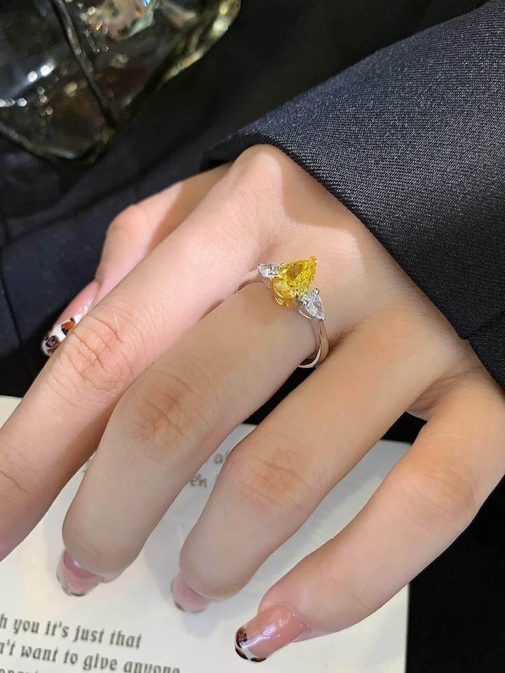 แหวนมอสซาไนต์สีเหลืองทรงลูกแพร์ 2 กะรัต ประดับเพชรสามเม็ด สำหรับผู้หญิง เงินแท้ 925 ของแท้ สำหรับเป็นของขวัญแทนใจสำหรับคนรัก
