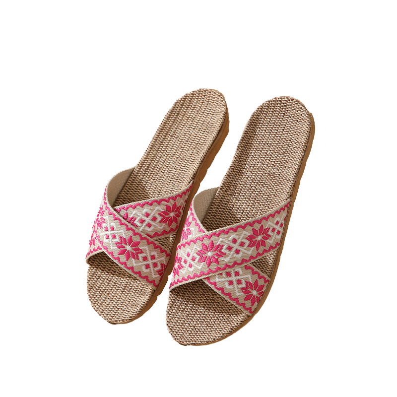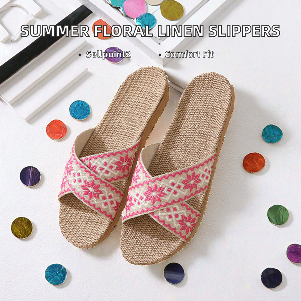 รองเท้าผ้าลินินสำหรับฤดูร้อน ดีไซน์ลายดอกไม้แบบเปิดนิ้วเท้า พื้นรองเท้า EVA ทนทานต่อการสึกหรอ เหมาะสำหรับใช้ภายในอาคาร ซับใน PVC ขายส่ง
