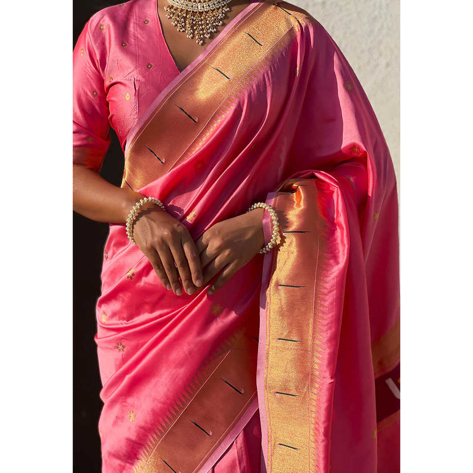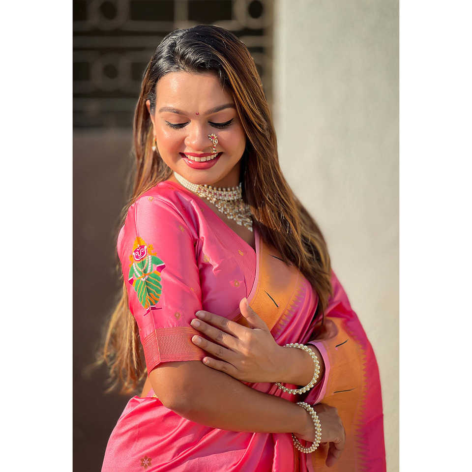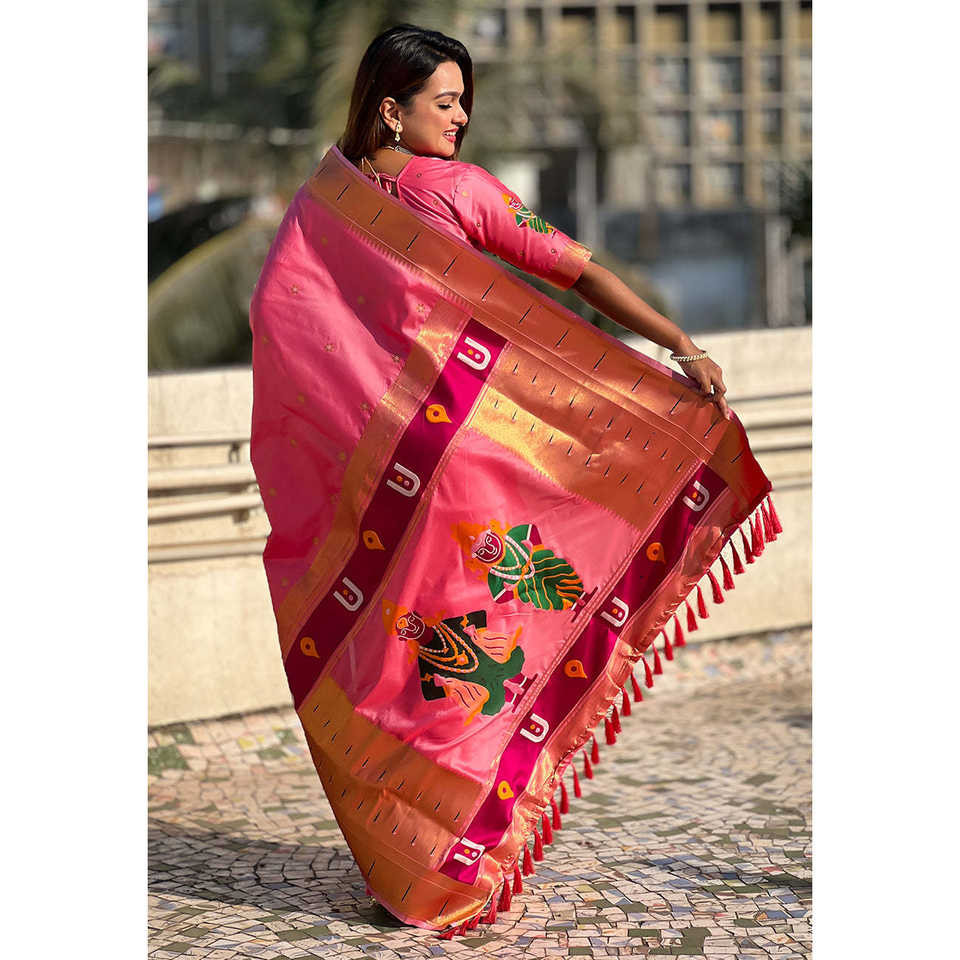 ผ้าไหมพิธานีแบบดั้งเดิมพิเศษ สีชมพูอ่อน พร้อมลายปักดิ้นทอง วิธะลา ก็อด เสื้อผ้าอินเดียและปากีสถาน ผ้าทอชั้นดี น้ำหนัก 650 กรัม