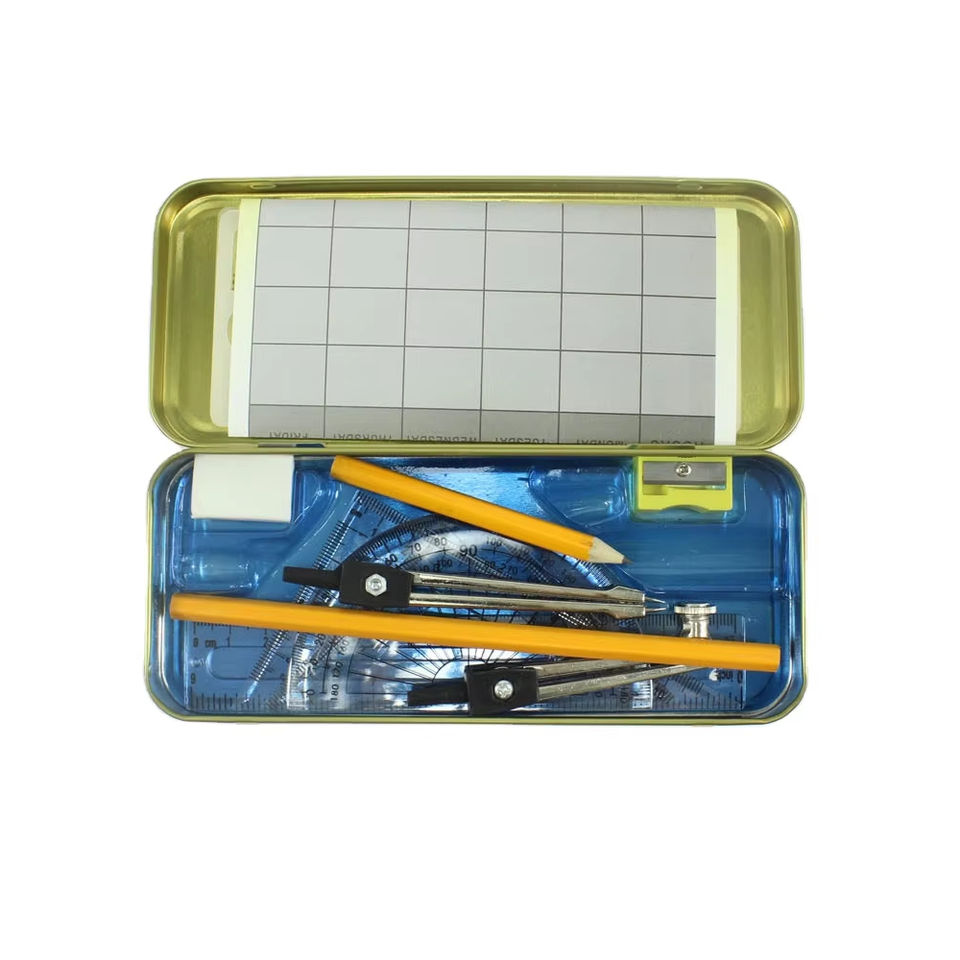 เชี่ยวชาญในการผลิตกล่องดินสอออกแบบได้ตามต้องการชุดคณิตศาสตร์พลาสติกโลหะแผ่นดีบุกไม้บรรทัดกล่องเหล็กสอบ