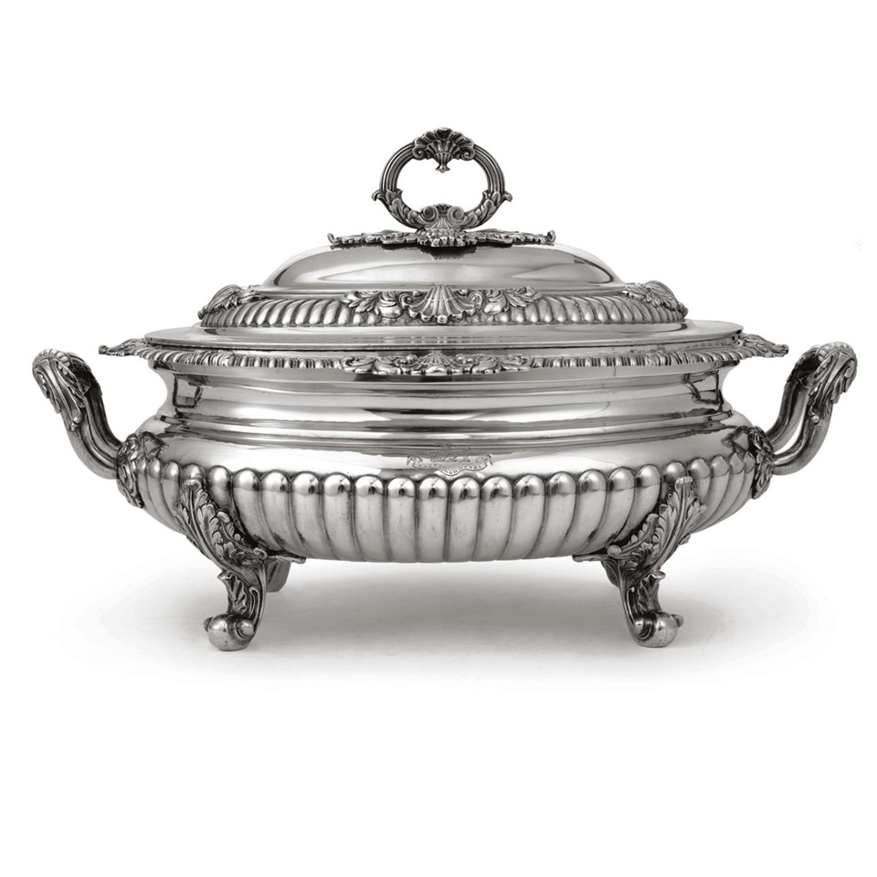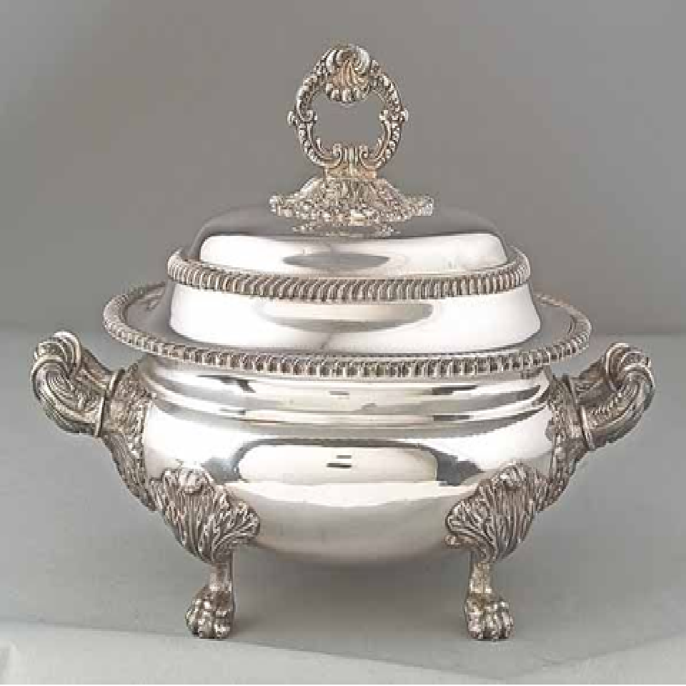 ชามทรงกลมสีเงินขัดเงา พร้อมขอบประดับลูกปัดอย่างประณีต และขาทรงใบอะแคนธัส มีจำหน่ายในราคาขายส่ง