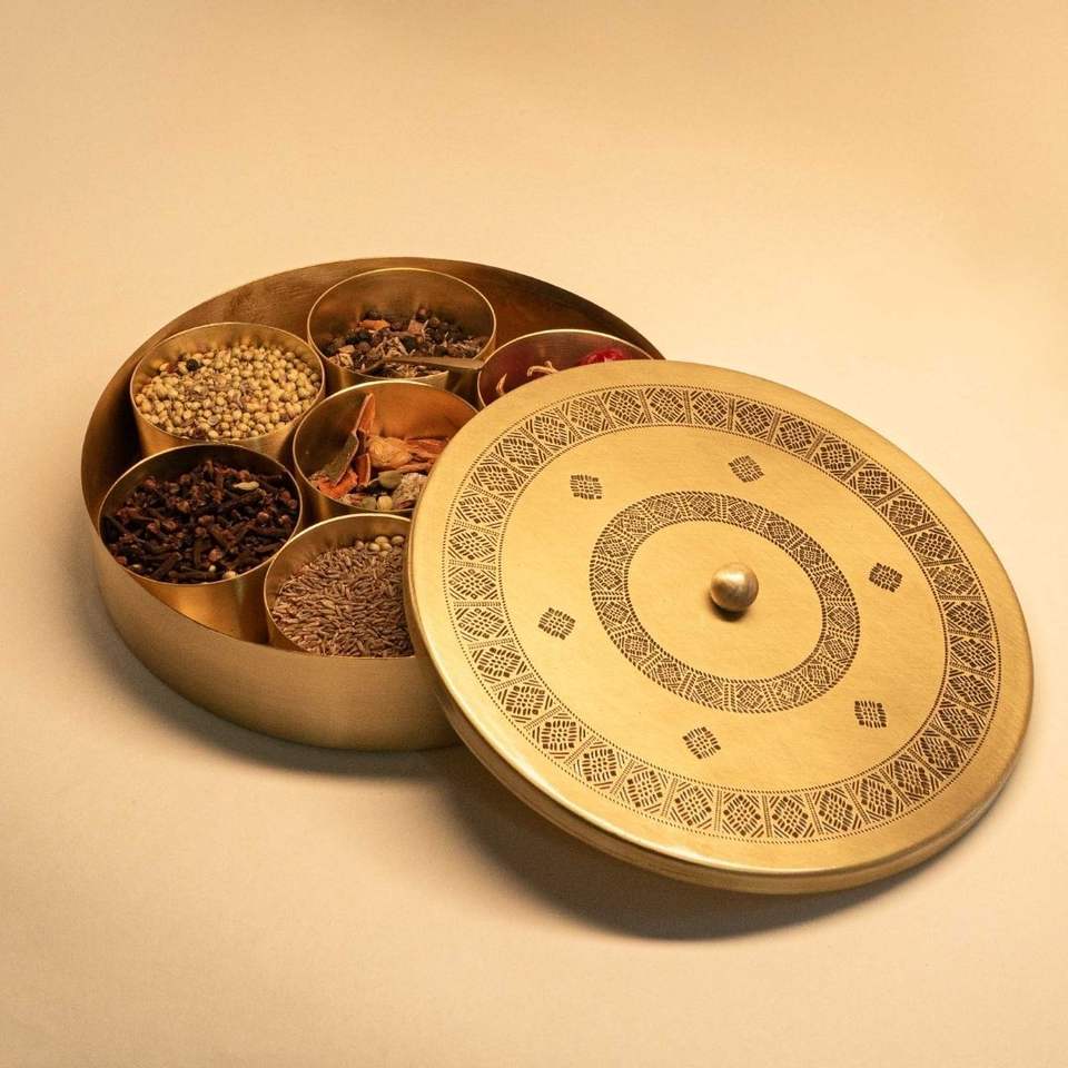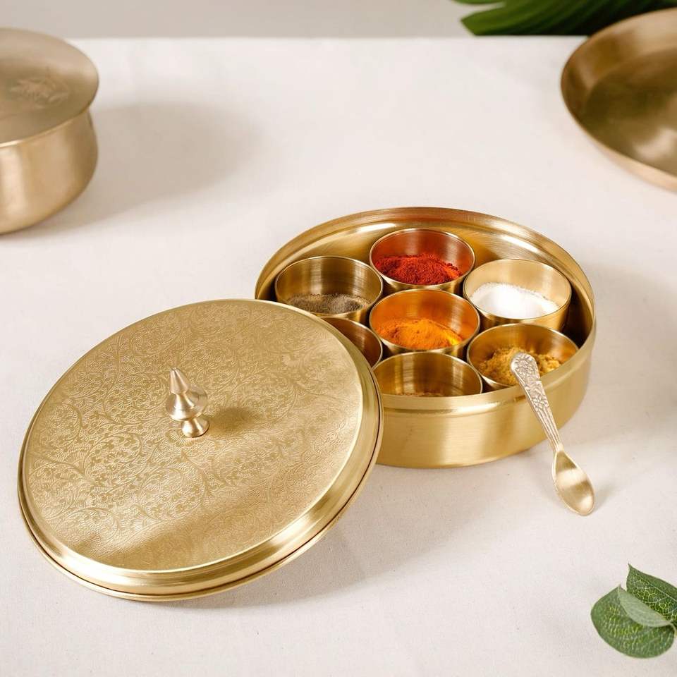 กล่องเครื่องเทศเหล็ก/ทองเหลือง กล่องมาซาลา/กล่องใส่เครื่องเทศ กล่องเครื่องเทศทองเหลืองโบราณ กล่องเครื่องเทศทองเหลืองทำมือ ชุดกล่องเครื่องเทศสำหรับห้องครัว พร้อมช้อน 7 กล่อง