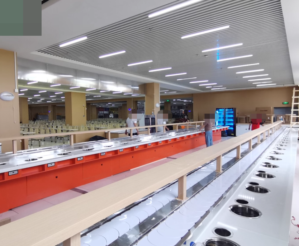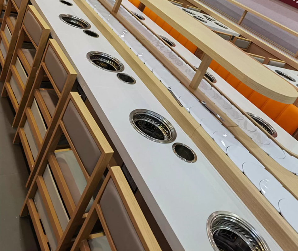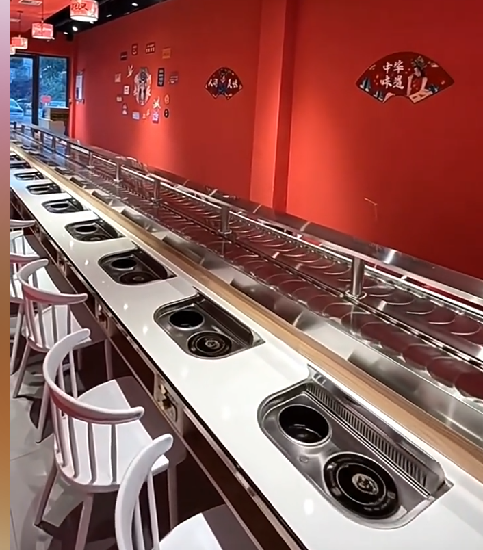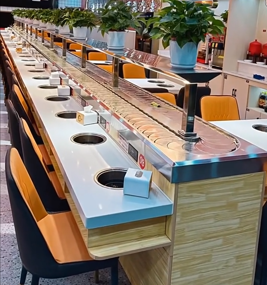 โต๊ะหม้อไฟหมุนได้ รางหม้อไฟหมุน อุปกรณ์หม้อไฟแบบหมุน สายพานหม้อไฟแบบหมุนสำหรับร้านอาหารบุฟเฟ่ต์
