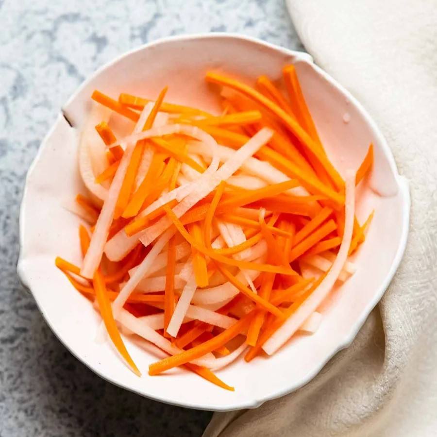 หัวไชเท้าสีขาว, น้ำส้มสายชู, น้ำ, น้ำตาล, เกลือ, กระเทียมส่วนผสม