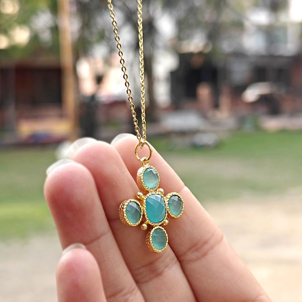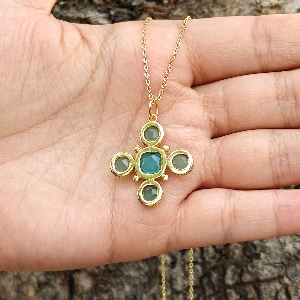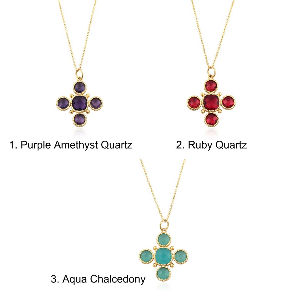 สร้อยคอจี้รูปกางเขนประดับด้วยอเมทิสต์สีม่วงอ่อน ดีไซน์เรียบหรู วัสดุโลหะเคลือบทอง 18k พร้อมสายสร้อยทองเหลือง