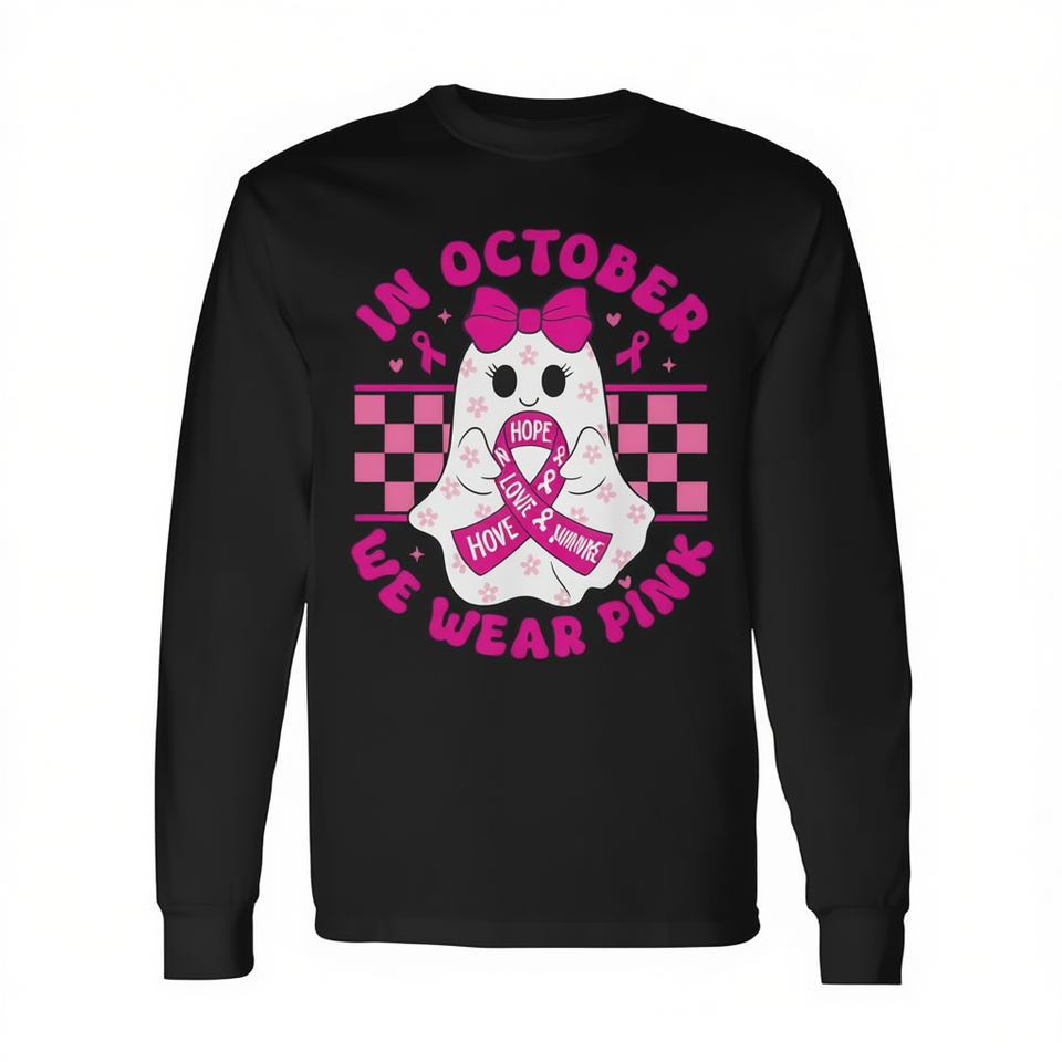 เสื้อยืดแขนยาวสีชมพูเพื่อสร้างความตระหนักรู้เกี่ยวกับมะเร็งเต้านมในวันฮาโลวีนสุดหลอน