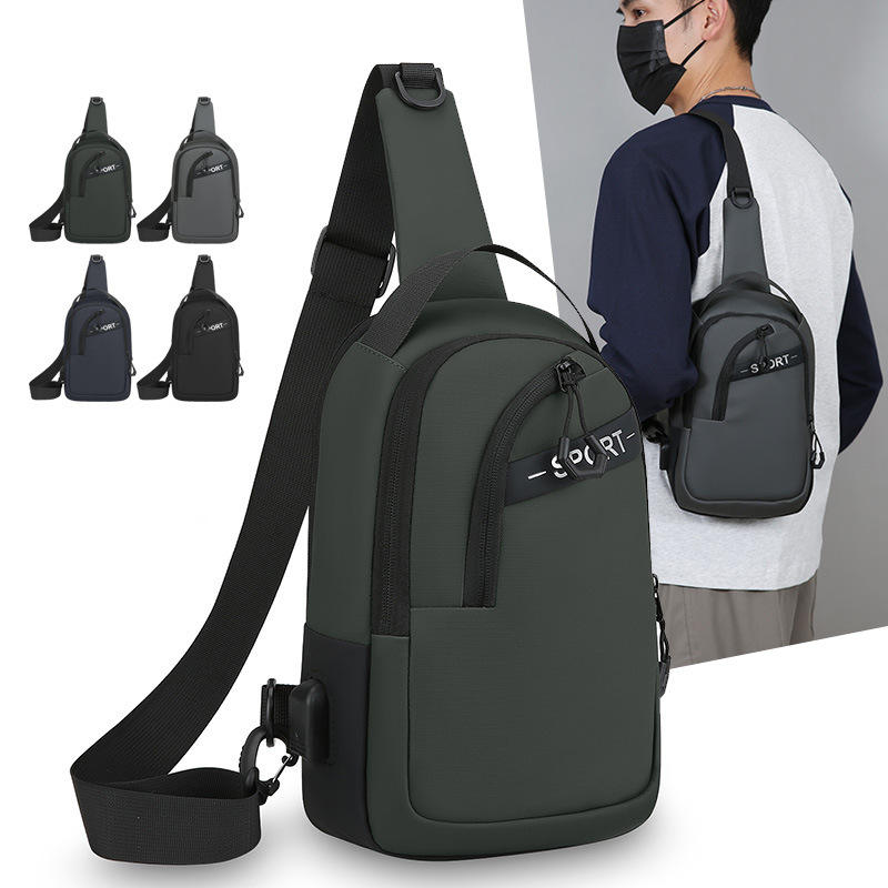 กระเป๋าคาดหน้าอกสำหรับผู้ชาย ความจุขนาดใหญ่ วัสดุเคลือบผิว กระเป๋าสะพายข้างสำหรับเดินทางกลางแจ้ง พร้อมพอร์ต USB สีเทา สีดำ สีน้ำเงินเข้ม