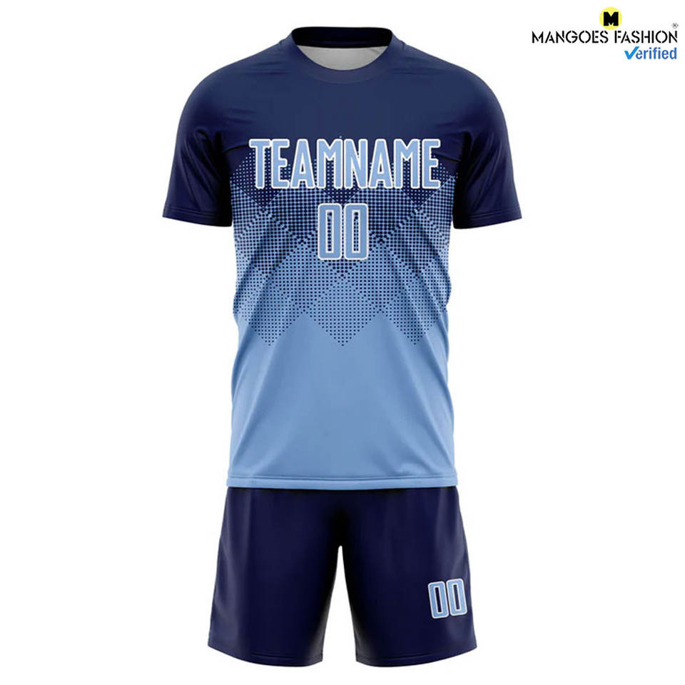 ชุดกีฬาฟุตบอลชุดเสื้อเจอร์ซีย์เสื้อฟุตบอลสีฟ้า-ขาวน้ำเงินอ่อนออกแบบได้ตามต้องการ