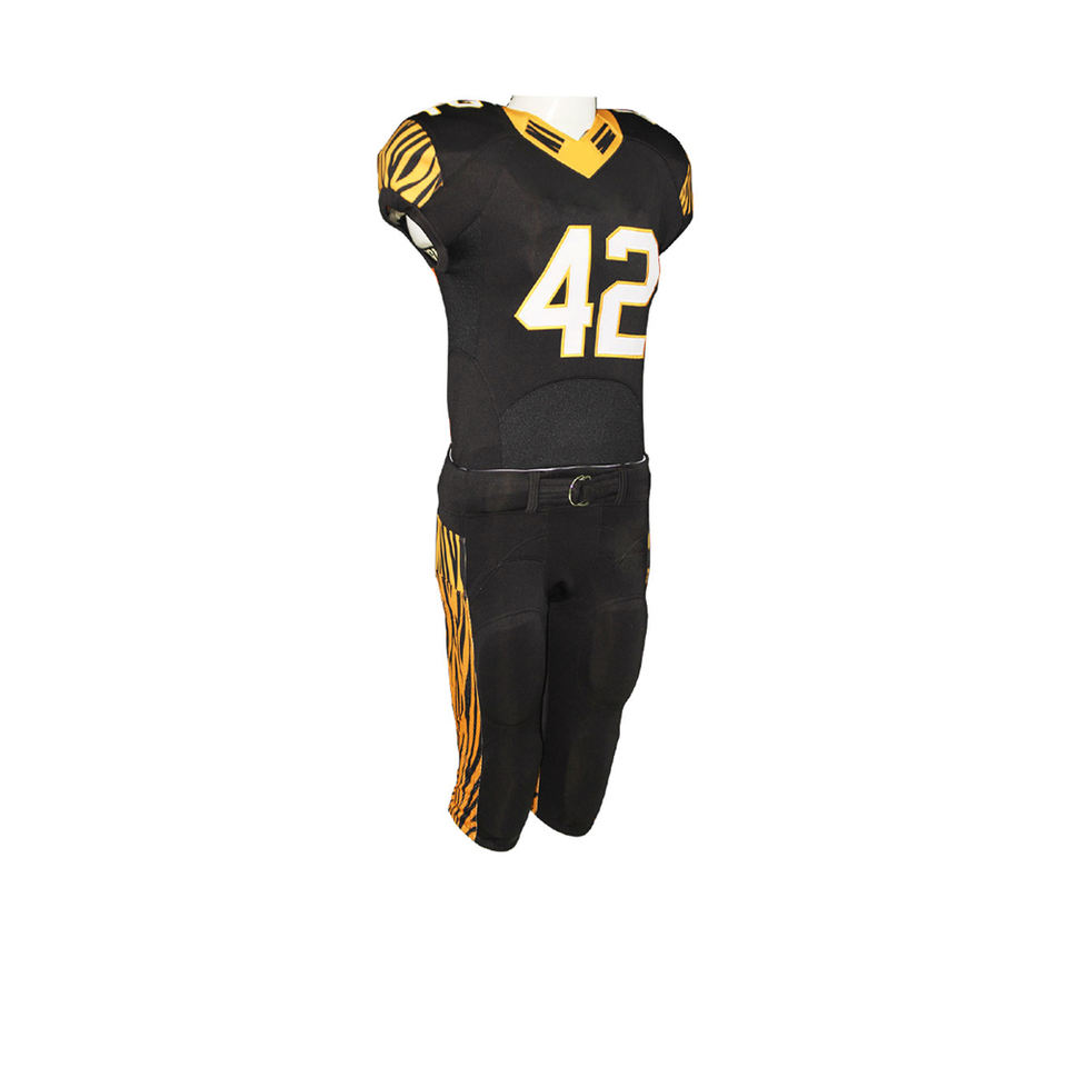 ชุดกีฬาชุดเครื่องแบบอเมริกันเสื้อสีดำและกางเกงสีขาวชุดเครื่องแบบอเมริกันฟุตบอลเยาวชนอเมริกันที่มีโลโก้และหมายเลข