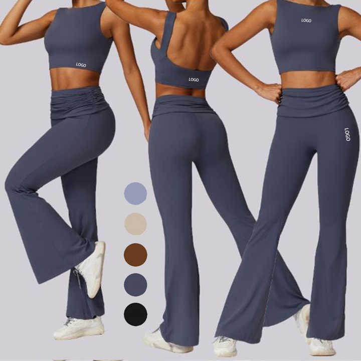 ชุดออกกำลังกายสำหรับผู้หญิง เสื้อผ้ากีฬา วิ่ง โยคะ กางเกงเลกกิ้งทรงบาน ชุดออกกำลังกายสองชิ้น ชุดฟิตเนส ผ้าสแปนเด็กซ์ ไนลอน ระบายอากาศได้ดี