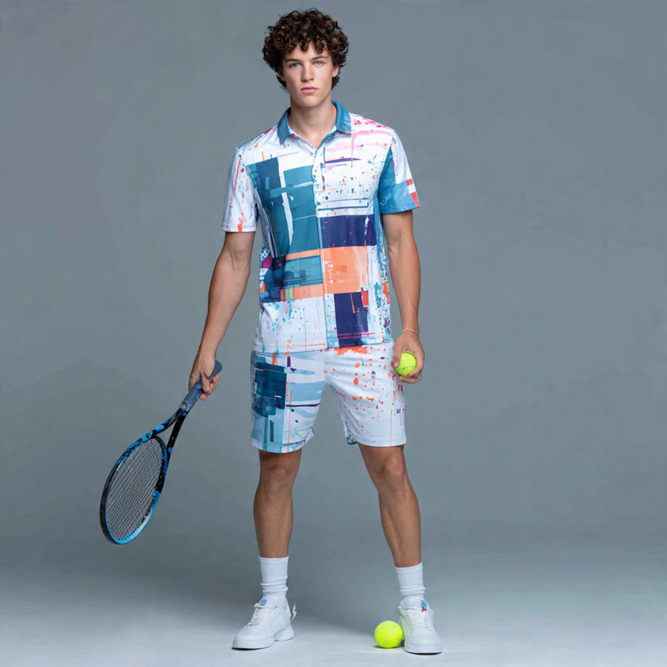 ชุดกีฬาเทนนิสแบบซับลิเมชั่นสำหรับผู้ชาย ชุดฝึกซ้อม เสื้อโปโลแบดมินตันพิมพ์ลาย กางเกงขาสั้นเทนนิส ชุดกีฬาแบดมินตัน