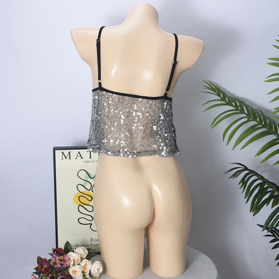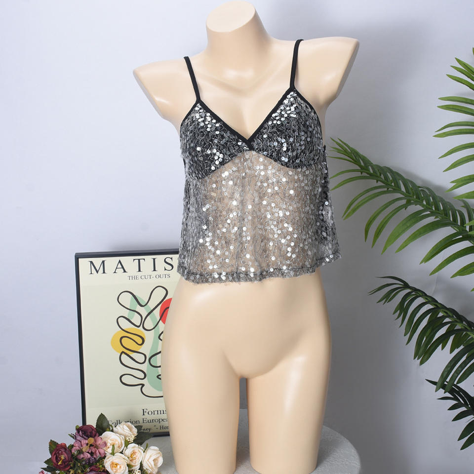 เสื้อสายเดี่ยวคอวีประดับเลื่อมซีทรูสุดเซ็กซี่สำหรับผู้หญิงแฟชั่น