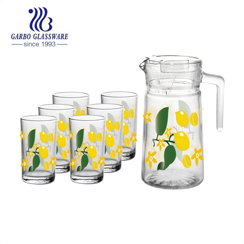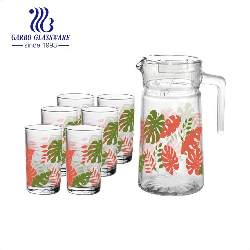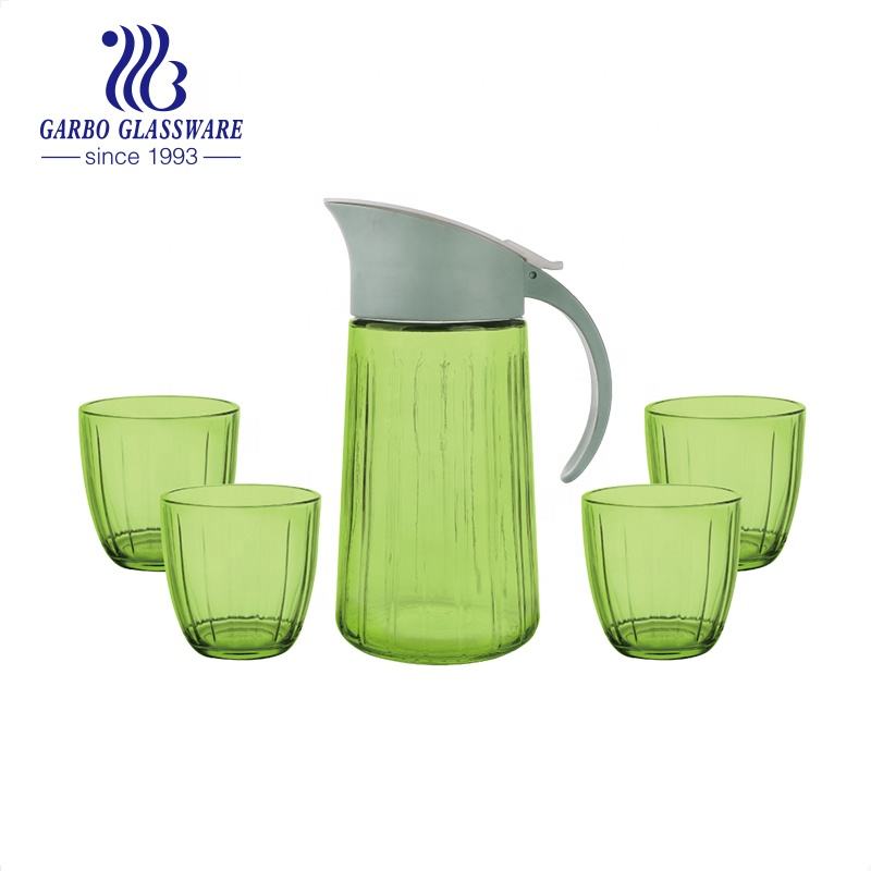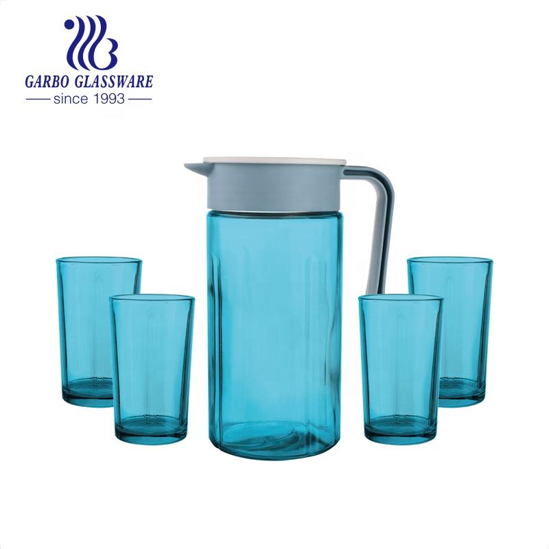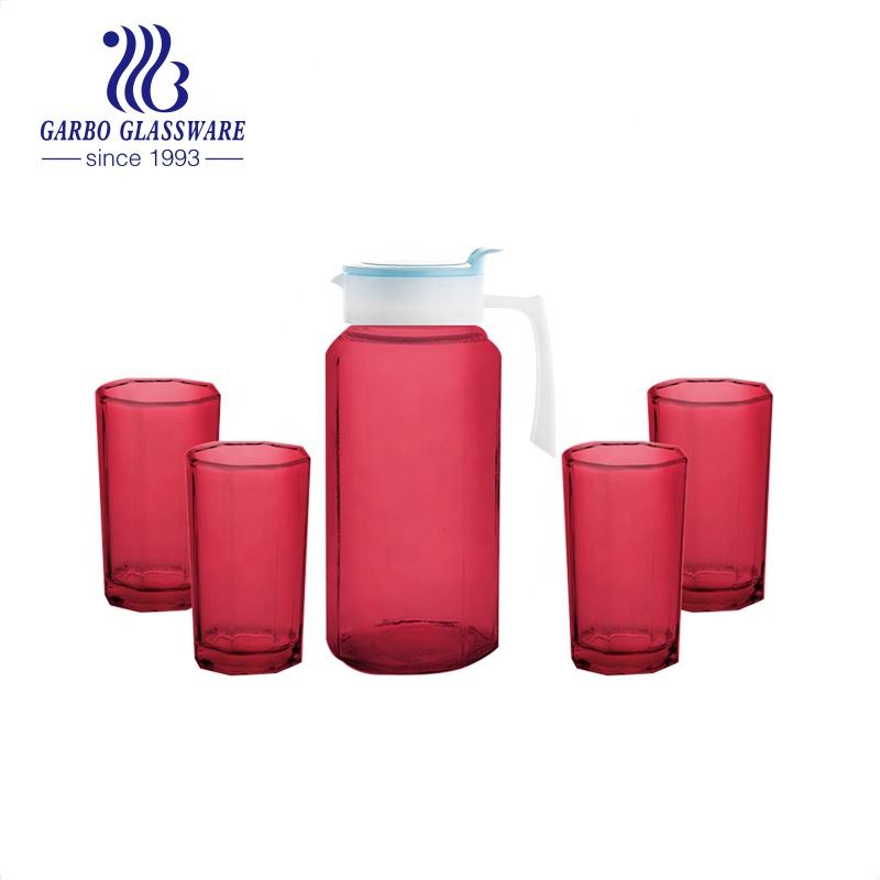 การฉีดพ่นเหยือกแก้วสีและชุดถ้วยดื่ม5ชิ้นรูปลอกที่ขายดีกำหนดราคาถูกแก้วเหยือกน้ำและชุดแก้วน้ำ