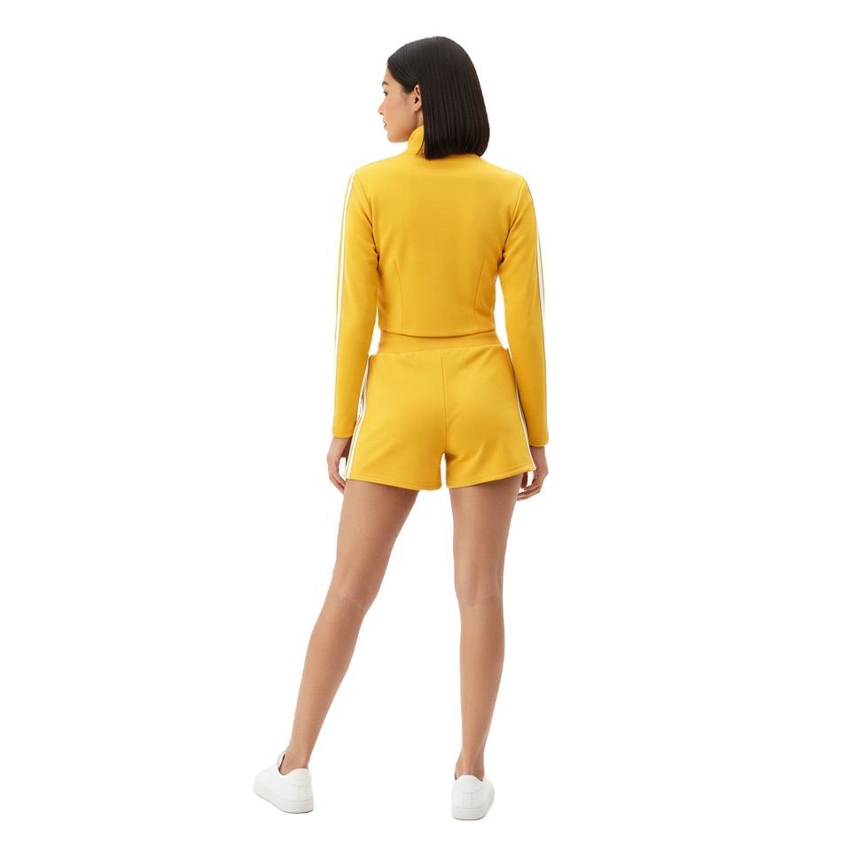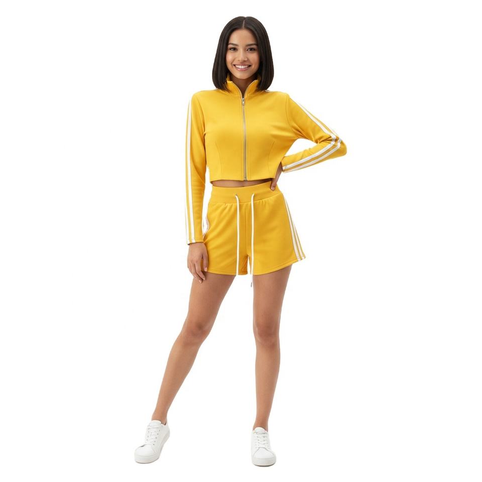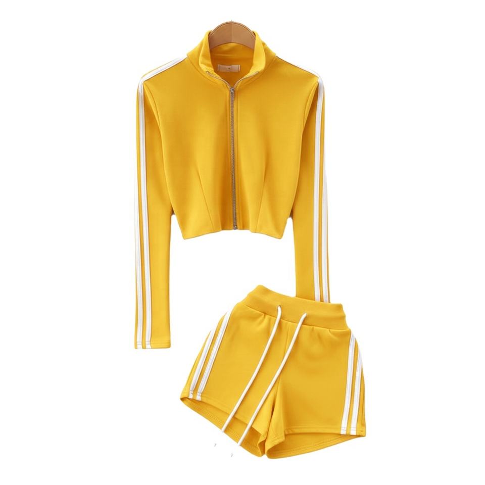 ชุดเซ็ทลำลองสปอร์ต 2 ชิ้นสำหรับผู้หญิง เสื้อครอปท็อปคอตั้งผ้าทอเนื้อนุ่ม และกางเกงขาสั้นเอวสูง ชุดออกกำลังกาย ขายส่ง