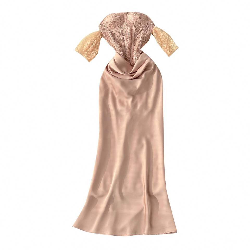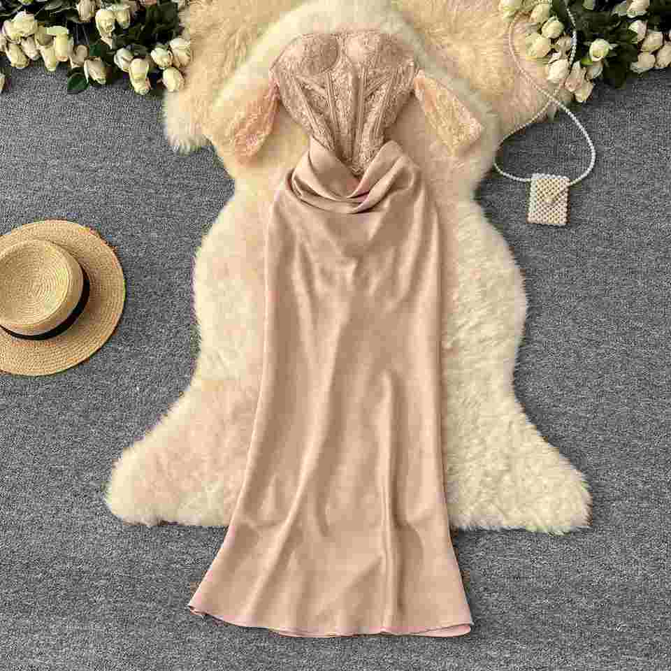 เดรสลำลองผ้าซาตินทอลายลูกไม้แบบไม่มีสายคล้องไหล่สำหรับฤดูร้อน ดีไซน์หรูหรา ความยาวปานกลาง สำหรับผู้หญิง แขนกุด ทรงเอ็มไพร์ ตกแต่งผ้าปะติดปะต่อ ปักลายดิจิทัล ระบายอากาศได้ดี
