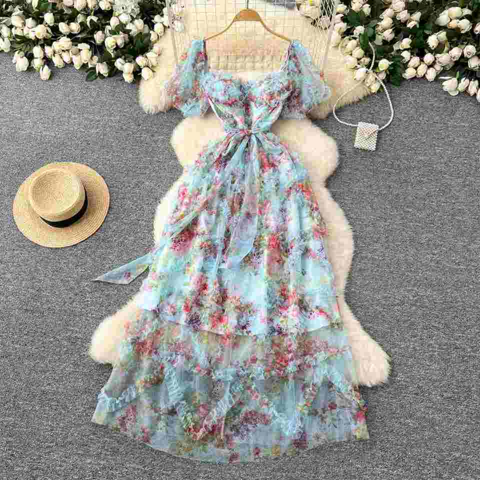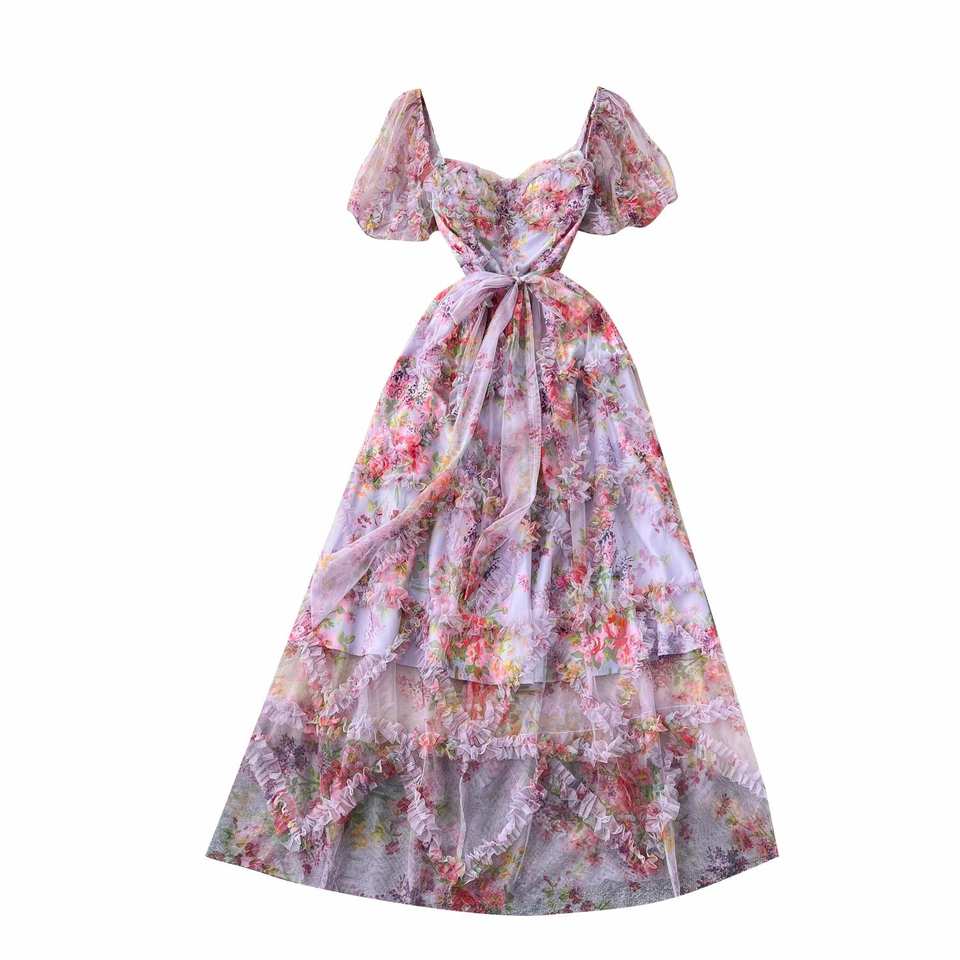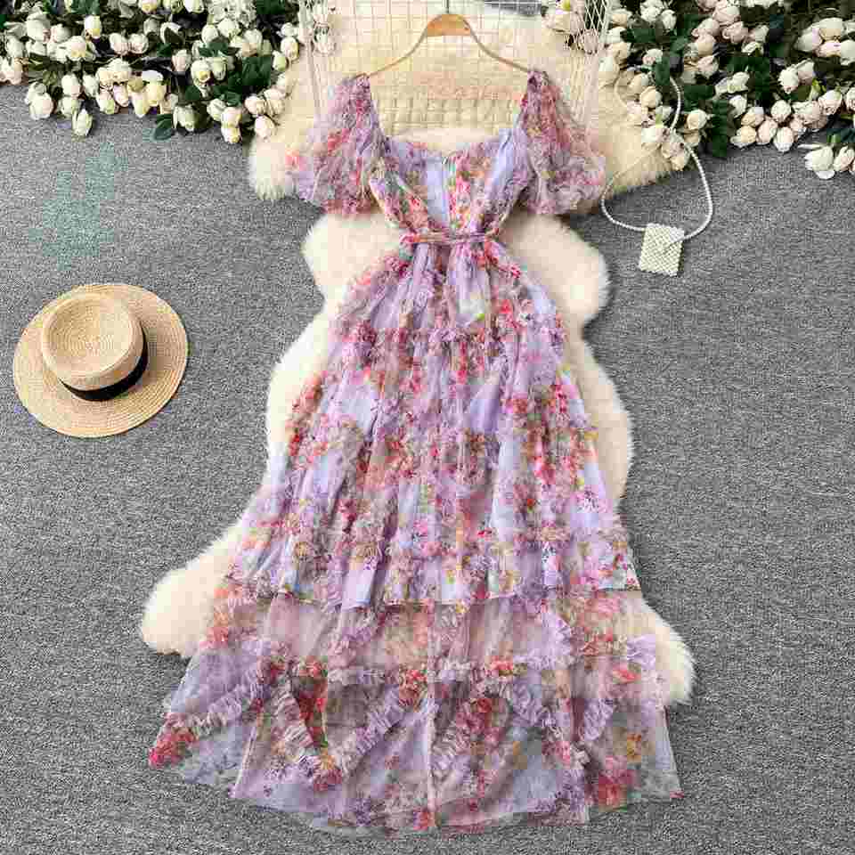 ชุดเดรสสปริงแฟรี่คอร์แบบทอผ้าดิจิทัลรักษ์โลกทรงสลิมสำหรับผู้หญิง แต่งระบายยาวปานกลาง เอวทรงเอ็มไพร์ ผ้าตาข่าย สีม่วง