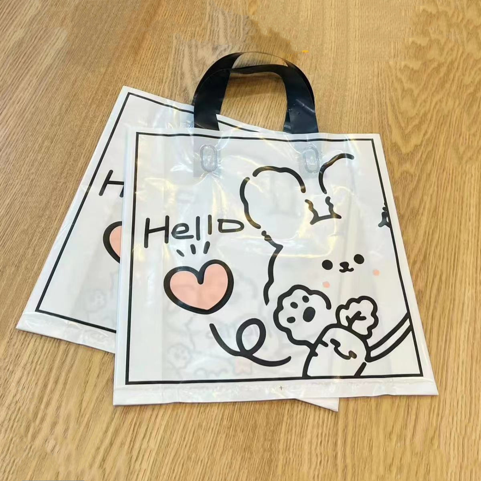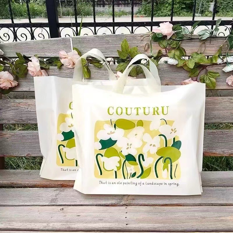 ถุงช้อปปิ้งพลาสติก PE ใช้ซ้ำได้แนวฤดูใบไม้ผลิพร้อมพิมพ์ลายกราเวียร์-โลโก้ตามสั่งเป็นมิตรกับสิ่งแวดล้อมสำหรับใช้ในร้านบูติก