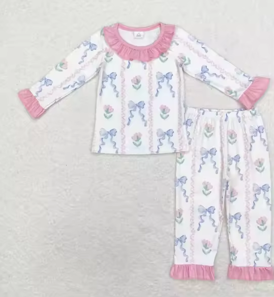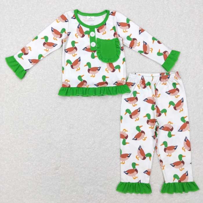 ชุดเสื้อผ้าเด็กผู้หญิงสองชิ้นลายเป็ดมอลลาร์ด แขนยาว เสื้อและกางเกง ชุดเด็กแต่งระบาย