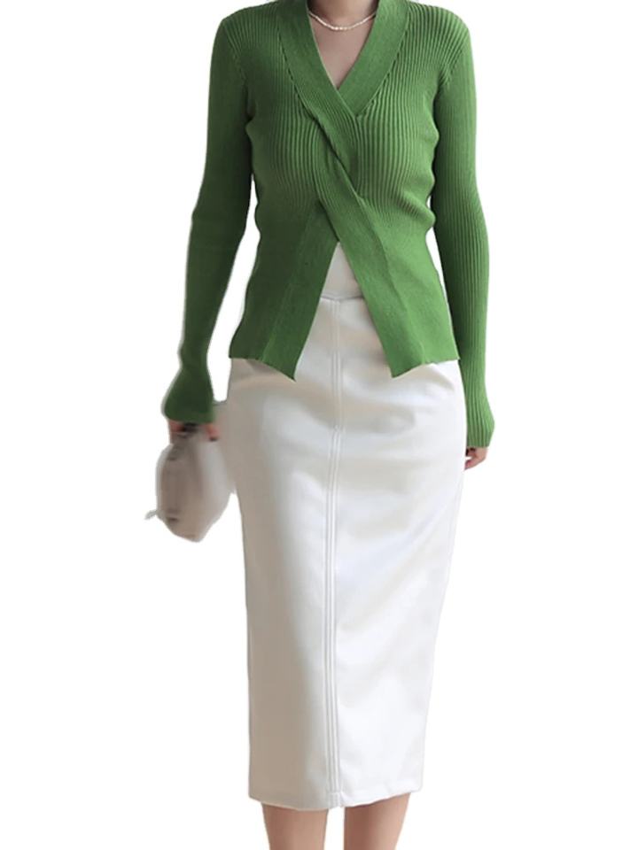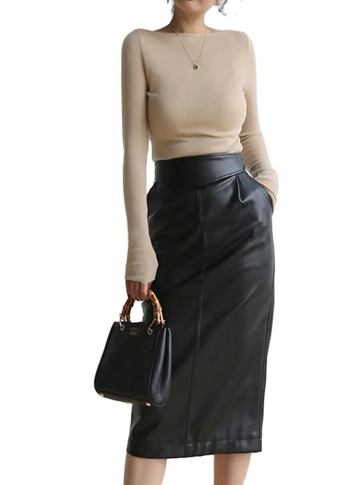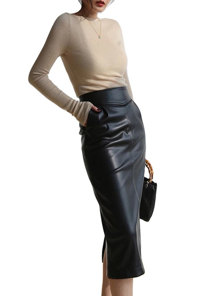กระโปรงหนัง PU ทรงดินสอเอวสูงสำหรับผู้หญิง สีน้ำตาล ขาว ดำ ยาวปานกลาง รุ่นสปริง 2023 ผ่าข้างมีซิป